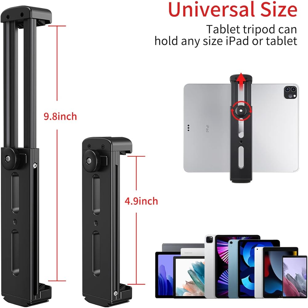 • 【توافق عالي】حامل ثلاثي القوائم للتابلت يناسب معظم أجهزة التابلت، يفتح لأعلى وأسفل 4.9-9.8 انش وهو مناسب على نطاق واسع لجميع أجهزة التابلت مقاس 7.9 انش - 12.9 انش، متوافق مع ايباد برو 12.9/ 11/ 10.5/ 9.7، ايباد الجيل الثامن 10.2 انش، ايباد ميني، ايباد اير 1 2 3 4، مايكروسوفت سيرفس برو X/X/X/X/برو 7/برو 6/برو/برو 4/برو 3/سيرفس جو، سلسلة سامسونج جالكسي تاب، نيكسس، كيندل، قارئ إلكتروني إلخ