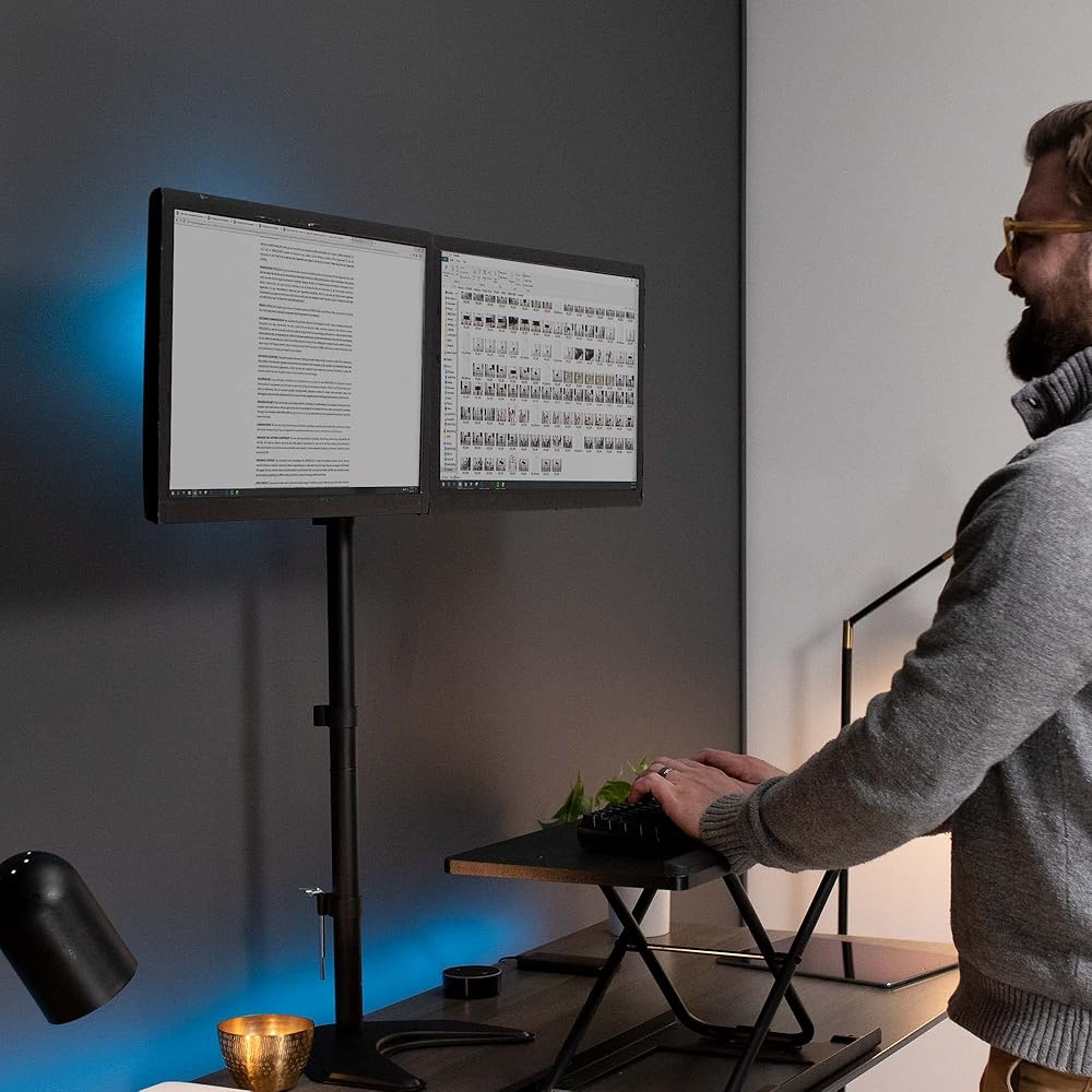 أكمل مساحة مكتبك مع حامل مكتب مزدوج قائم بذاته (STAND-V012F) من فيفو. قم بمسح مساحة العمل على مكتبك واستمتع بفوائد الوقوف أثناء العمل مع حامل الشاشة الطويل للغاية. يسمح العمود المركزي مقاس 40 انش وارتفاع شاشة الكمبيوتر القابل للتعديل للمستخدم بالتكيف بين وضعية الجلوس والوقوف. قم بشد أو فك كل مفصل لجعل الحامل سائلًا أو ثابتًا حسب الرغبة. تتضمن الميزات الخاصة إمكانية تعديل كل لوحة فيسا الفردية لأعلى وأسفل بمقدار 1 انش حتى تتم محاذاة شاشاتك بشكل مثالي (انظر الصور والفيديو لمزيد من المعلومات). كما جعلنا تركيب شاشاتك أمرًا سهلاً مع لوحات فيسا القابلة للفصل التي تثبت في شاشاتك ثم تنزلق مرة أخرى على إطار الحامل. مصنوع من الستيل عالي الجودة، تم تصميم هذا الحامل المتين لمقاومة الخدوش. تأتي بلمسة نهائية سوداء غير لامعة.