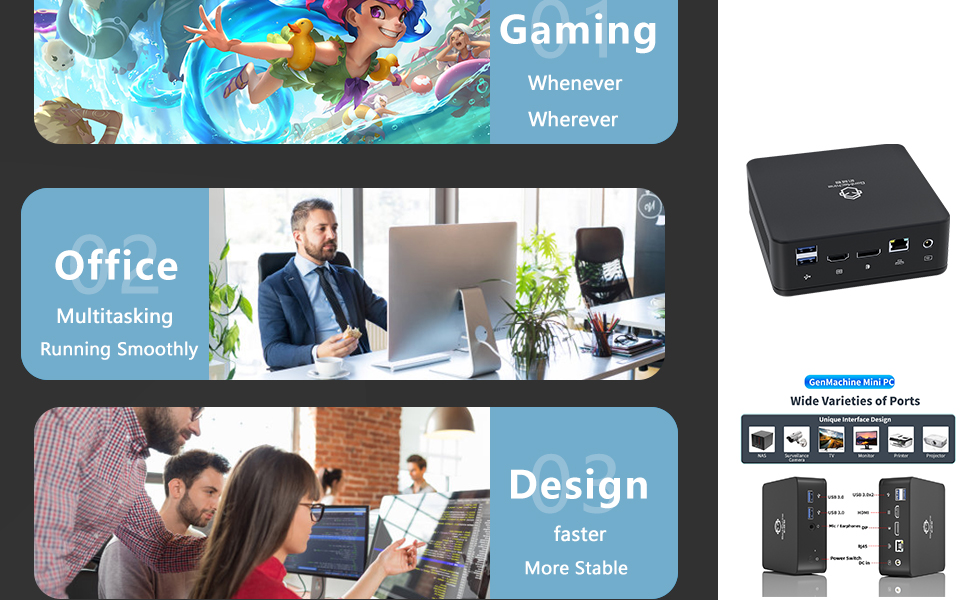 شاشات مزدوجة تدعم شاشتين: يحتوي جهاز HTPC (كمبيوتر المسرح المنزلي) على 1 HDMI لإخراج الفيديو بالإضافة إلى منفذ DP واحد بحيث يمكن توصيل جهاز الكمبيوتر الصغير الذي يعمل بنظام Windows 11 pro بشاشتين في نفس الوقت. يمكن استخدام الكمبيوتر كمركز وسائط في منزلك أو في الأماكن العامة مثل المتاجر ومحطات القطار لتشغيل الموسيقى أو الفيديو، أو إعداده لبث الإعلانات والمعلومات.