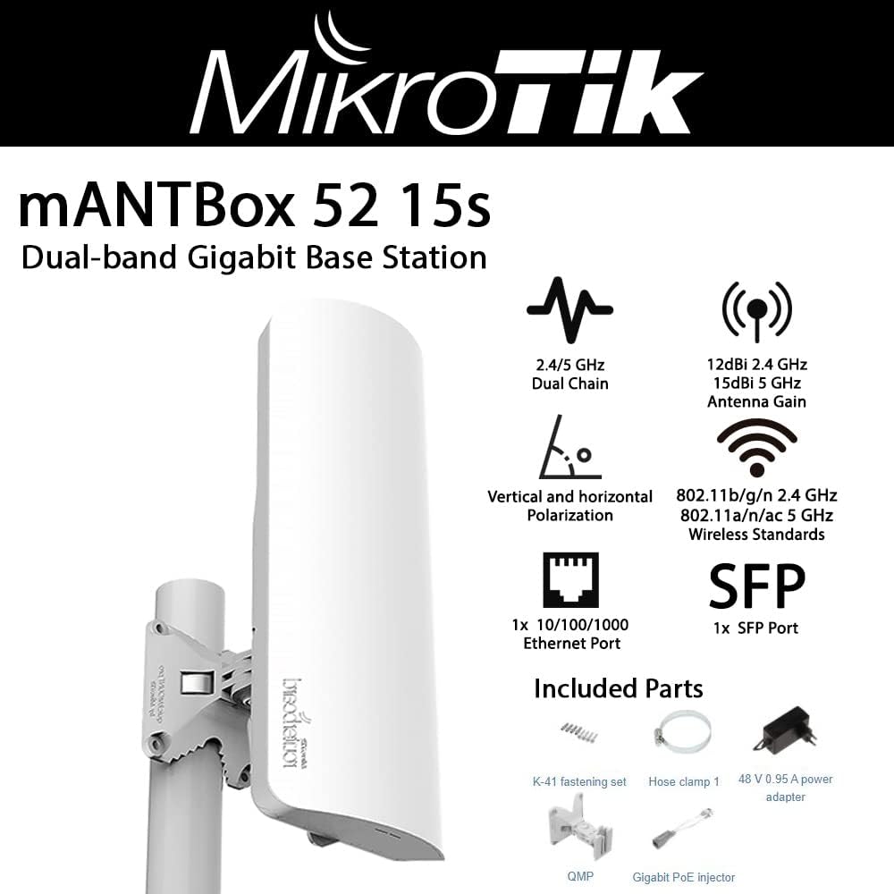 هل تدير شبكة لاسلكية خارجية مع مجموعة متنوعة من نقاط الوصول وأجهزة سي بي اي؟ إذًا فإن مانت بوكس 52 15s الجديد كليًا يوفر لك هوائيات مدمجة قوية وخيارات اتصال رائعة والمزيد! كان إنشاء اتصال فعال من نقطة إلى عدة نقاط أمرًا صعبًا، ولكن ليس بعد الآن: يعمل mANTBox 52 15s بشكل جيد في أي إعداد. تتيح لك القدرة اللاسلكية ثنائية النطاق استخدام كل من الأجهزة 2.4 جيجاهرتز و5 جيجاهرتز في نفس الوقت. يوجد منفذ جيجابت ايثرنت ومنفذ SFP لتوصيلات الألياف. لقد ضاعفنا ذاكرة الوصول العشوائي وأضفنا وحدة معالجة مركزية جديدة رباعية النواة يمكنها تحمل حتى أثقل الأحمال. يمكن أن يوفر مانت بوكس 52 15 ثانية تفريغ أجهزة IPsec دون مشاكل. اعتمادًا على بقية الإعدادات، يمكنك الوصول إلى مسافة تصل إلى 20 كم باستخدام هوائي الاستقطاب المزدوج المدمج.