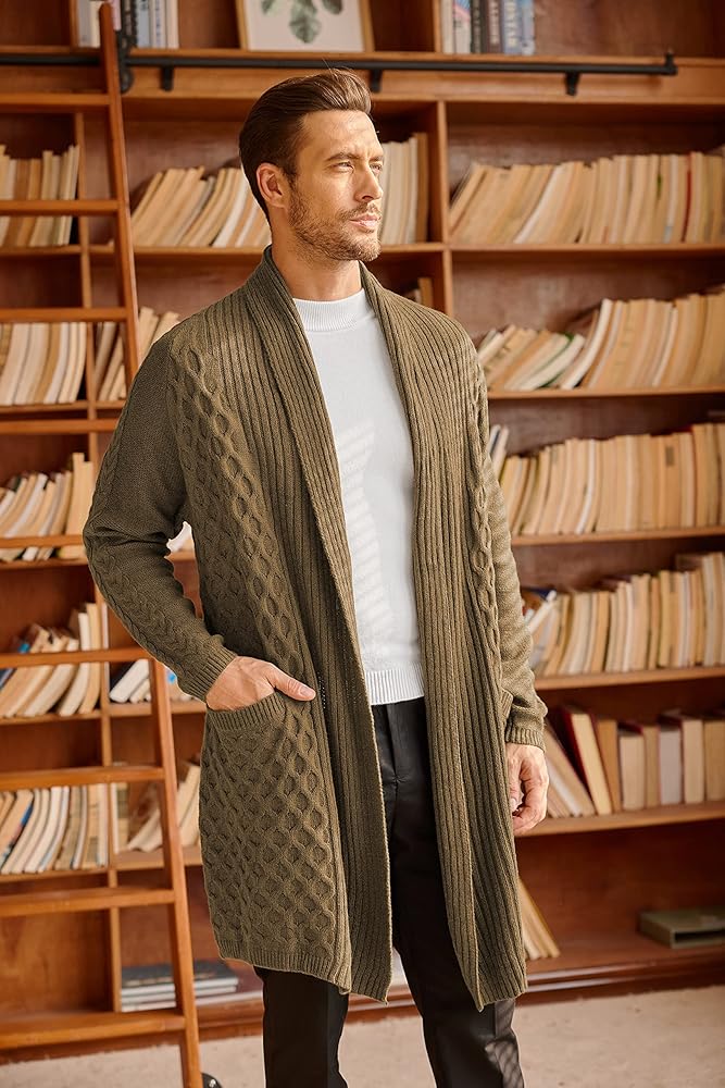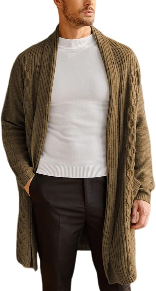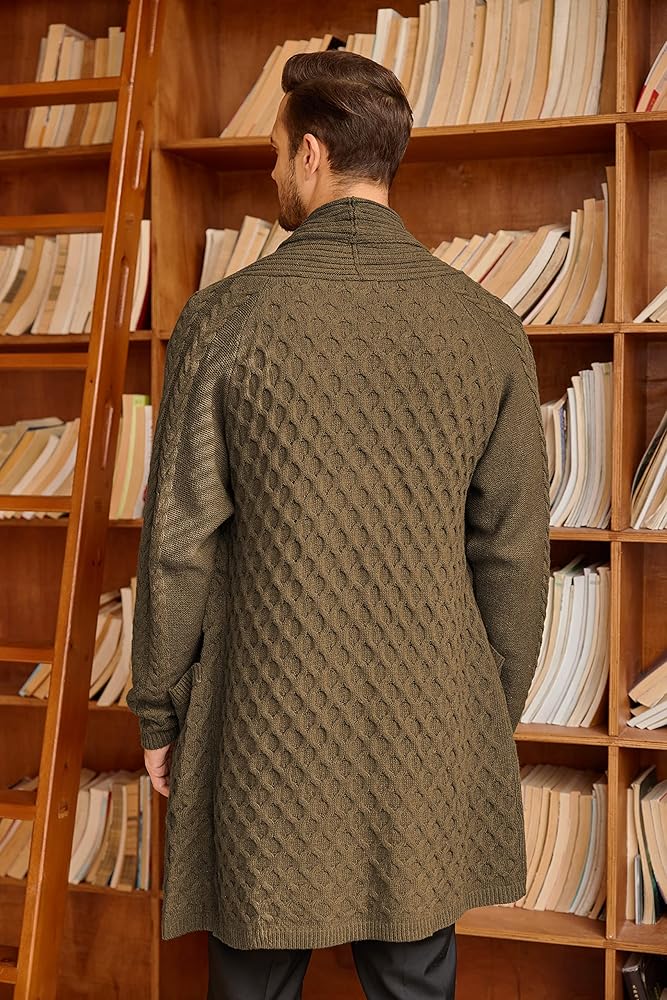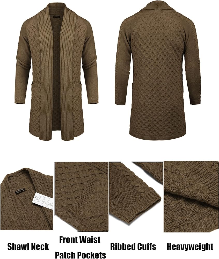 • الميزات - سترات كارديجان طويلة ثقيلة الوزن للرجال مصممة بأكمام طويلة، وياقة شال، ومفتوحة من الأمام، ومتماسكة للكابل، وجيبين أماميين على الخصر مريحة لتخزين الأشياء الصغيرة، أو ضع يديك فيها للتدفئة. سترة صوفية بياقة شال للرجال تخلق ثنية رائعة.