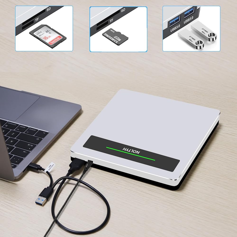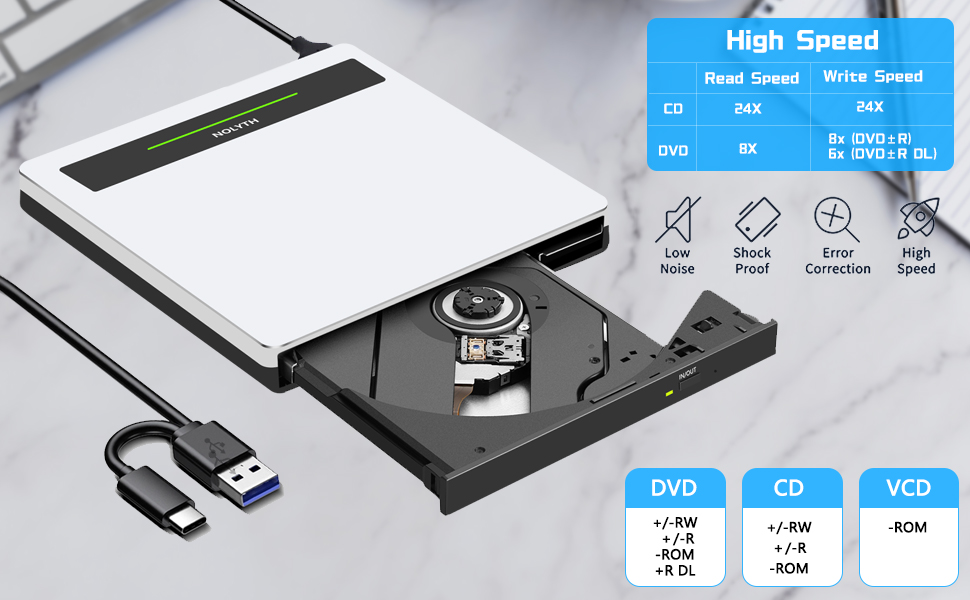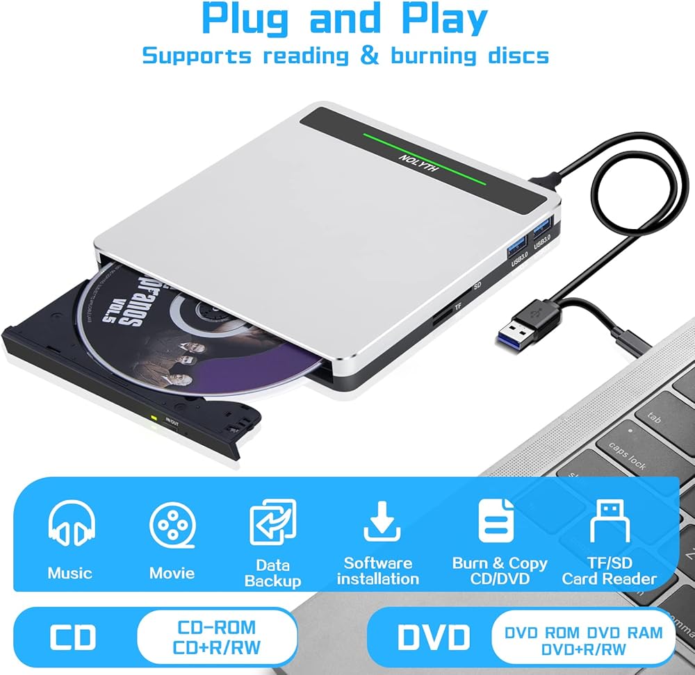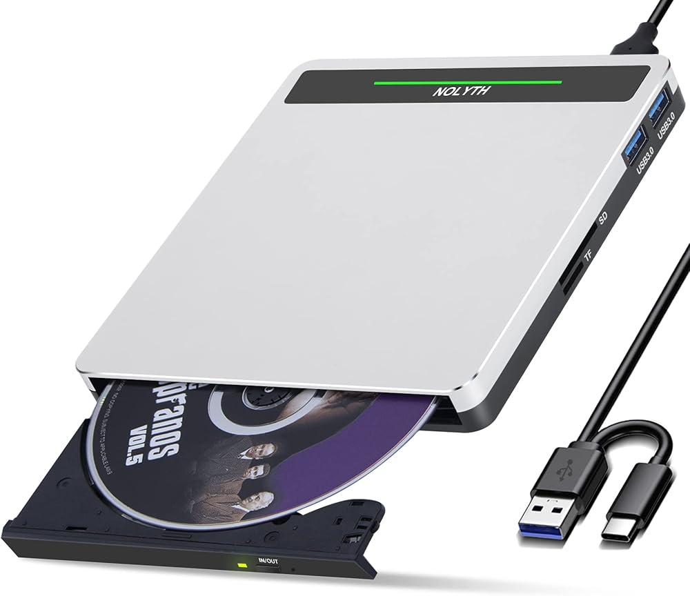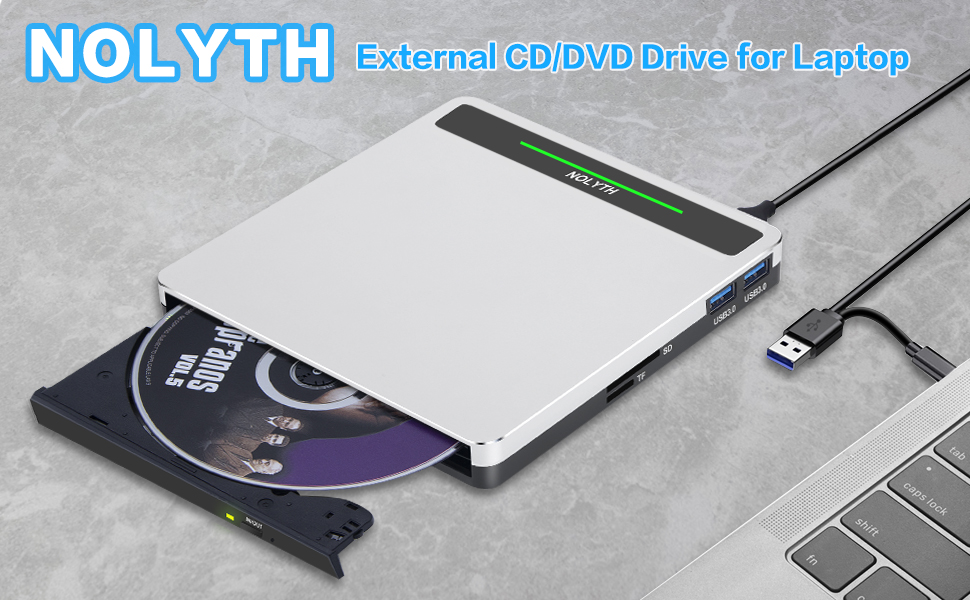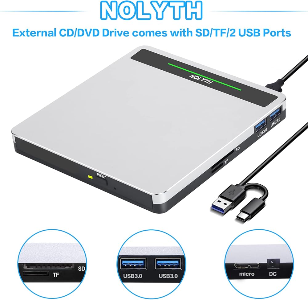 نوليث محرك أقراص سي دي في دي خارجي USB 3.0 نوع سي دي / دي في دي مع منفذ اس دي/تي اف/يو اس بي، مشغل دي في دي محمول للاب توب وقارئ الأقراص الضوئية وسي دي روم للكمبيوتر واللاب توب وماك بوك وويندوز وماك بوك وابل