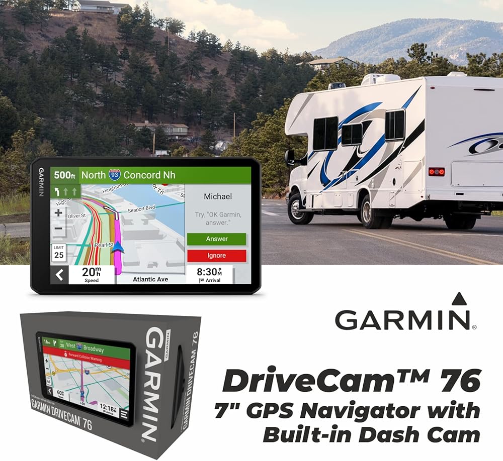 Garmin DriveCam 76، جهاز ملاح للسيارة GPS كبير وسهل القراءة مقاس 7 بوصات، كاميرا داش مدمجة، كشف تلقائي للحوادث، صور قمر صناعي عالية الدقة لعين الطيور مع حزمة الطاقة Wearable4U