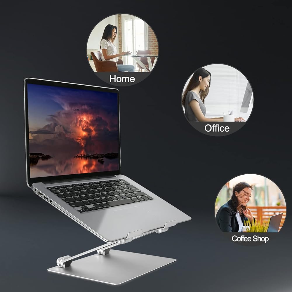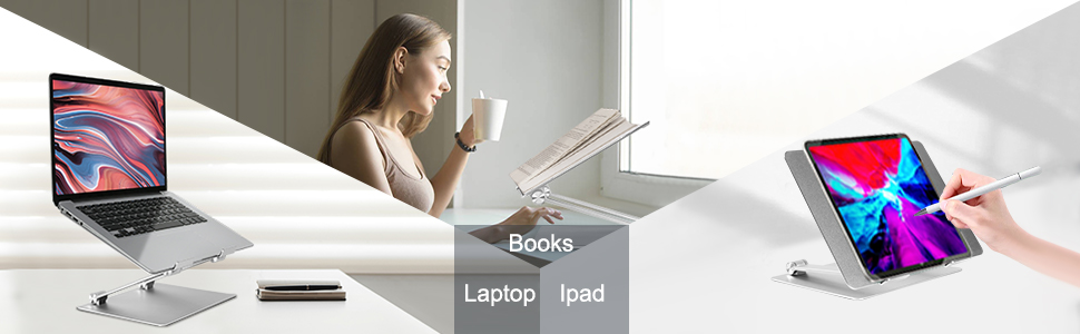 Heat Dissipation & Premium Aluminum - The laptop holder features a hollow design that allows more air to circulate to cool down your laptop and avoid overheating. the aluminium laptop stand plate also can well ventilate the heat generated by laptop, and the silicone pads are attached to protect laptops from scratches.