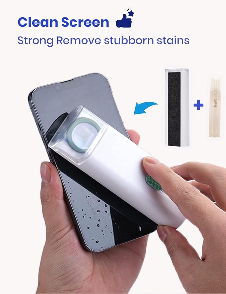 إزالة قوية بدون أثر: أخرج القارورة المدمجة من المنظف ورشها على شاشة الكمبيوتر أو الهاتف، ثم امسحها برفق بقطعة قماش للتنظيف من مجموعة التنظيف، يمكننا بسهولة إزالة البقع العنيدة، لا تقلق بشأن أي خدوش.