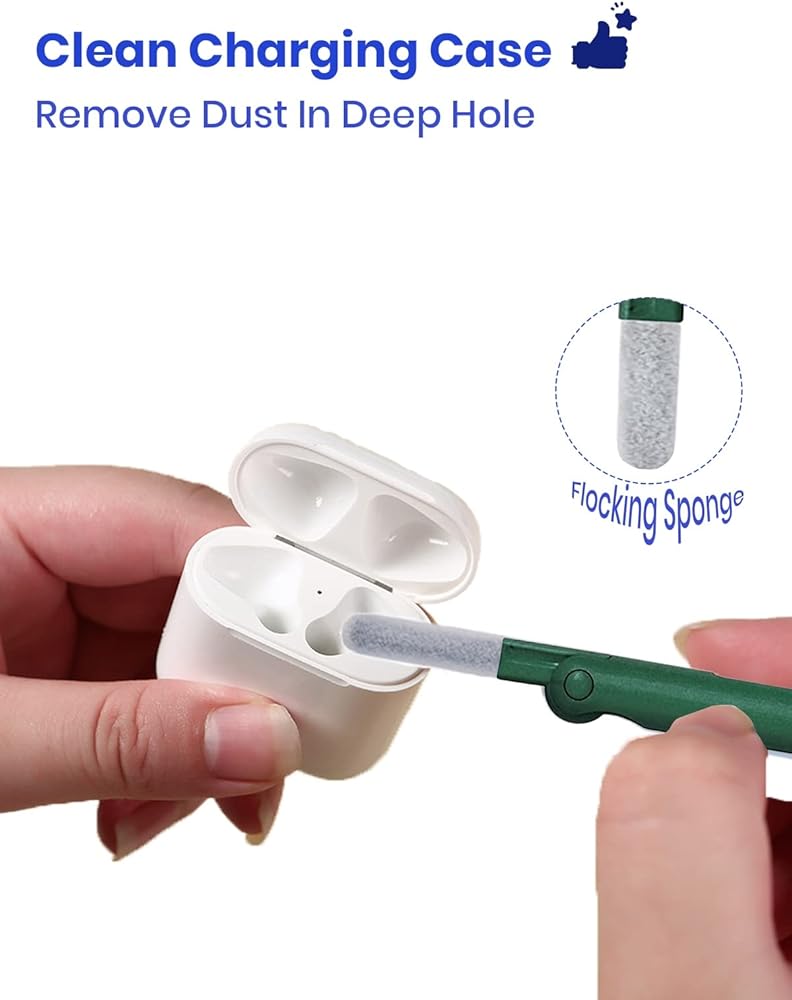 فجوات تنظيف عميقة: يمكن للطرف الناعم لمنظف سماعات الأذن التقاط شمع الأذن في سماعات الأذن والغبار الموجود في فجوة أغطية المفاتيح، ويمكن للإسفنجة المتدفقة أن تخترق صندوق الشحن لإزالة الأوساخ بالداخل؛