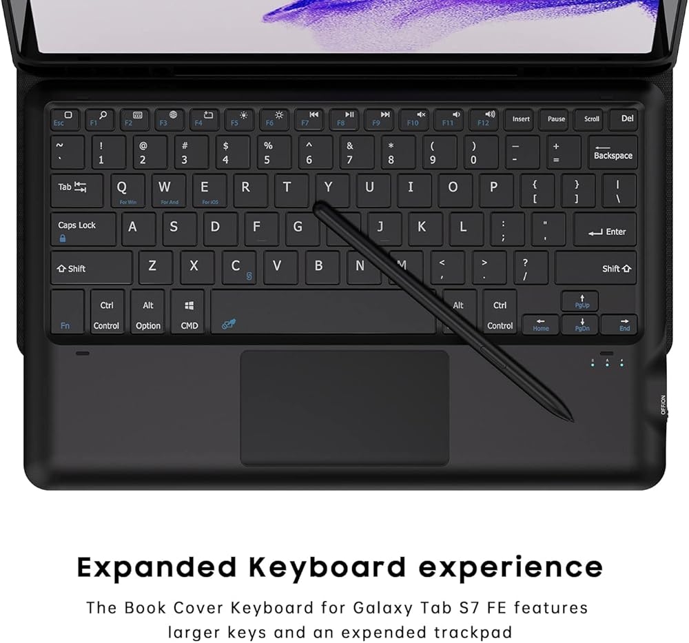 حامل قلم اس: جراب سامسونج جالكسي تاب اس 7 اف اي مع لوحة مفاتيح يدعم الشحن اللاسلكي لقلم اس، فتحة قلم محددة لوضع القلم عند شحنه بالكامل، وتجنب تلف بطارية القلم بشحنات متعددة