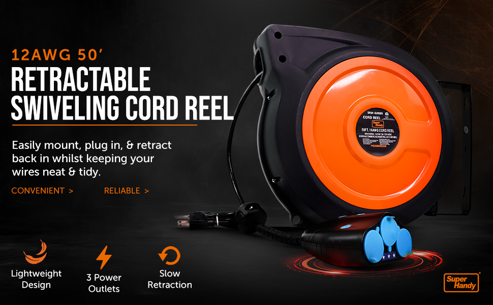 المواصفات - بكرة سلك التمديد هذه مصنوعة من مادة البولي بروبيلين المغلفة بنابض قوية التأثير وتأتي مع 12AWG × 50 قدم. سلك 3C/SJTOW وموصل صنبور ثلاثي (S3). يتكون سلك التمديد من مادة كابل SJTOW من الدرجة التجارية الممتازة. تم تصنيف الكابل المؤرض بالأسلاك الثلاثة الأساسية عند 15 أمبير 125 فولت تيار متردد 1875 وات 60 هرتز، باستخدام قابس ثلاثي الشقوق NEMA 5-15R / NEMA 5-15P يشتمل على سلك توصيل بطول 54 بوصة، وسدادة كابل قابلة للتعديل وبكرتين غير قابلتين للتمزق