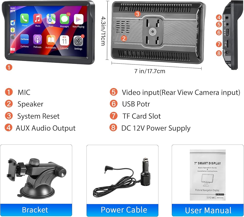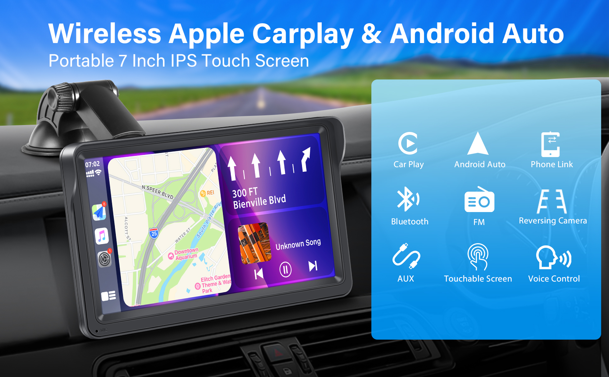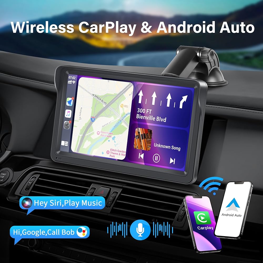 【Wirelsee Apple Carplay/Android Auto】يدعم Carplay المحمول Apple Carplay اللاسلكي وAndroid Auto. من خلال توصيل هاتفك أولاً باستريو السيارة المحمول عبر Bluetooth وwifi، يمكنك الوصول إلى تطبيقات iPhone والخرائط والموسيقى والمكالمات والميزات الأخرى مباشرةً من خلال شاشة العرض المحمولة التي تعمل باللمس في السيارة. كما أنه يدعم التحكم الصوتي عبر siri أو Google Assistant، مما يتيح استخدامًا أكثر أمانًا لميزات الهاتف أثناء القيادة، مما يوفر لك تجربة قيادة أكثر أمانًا.
