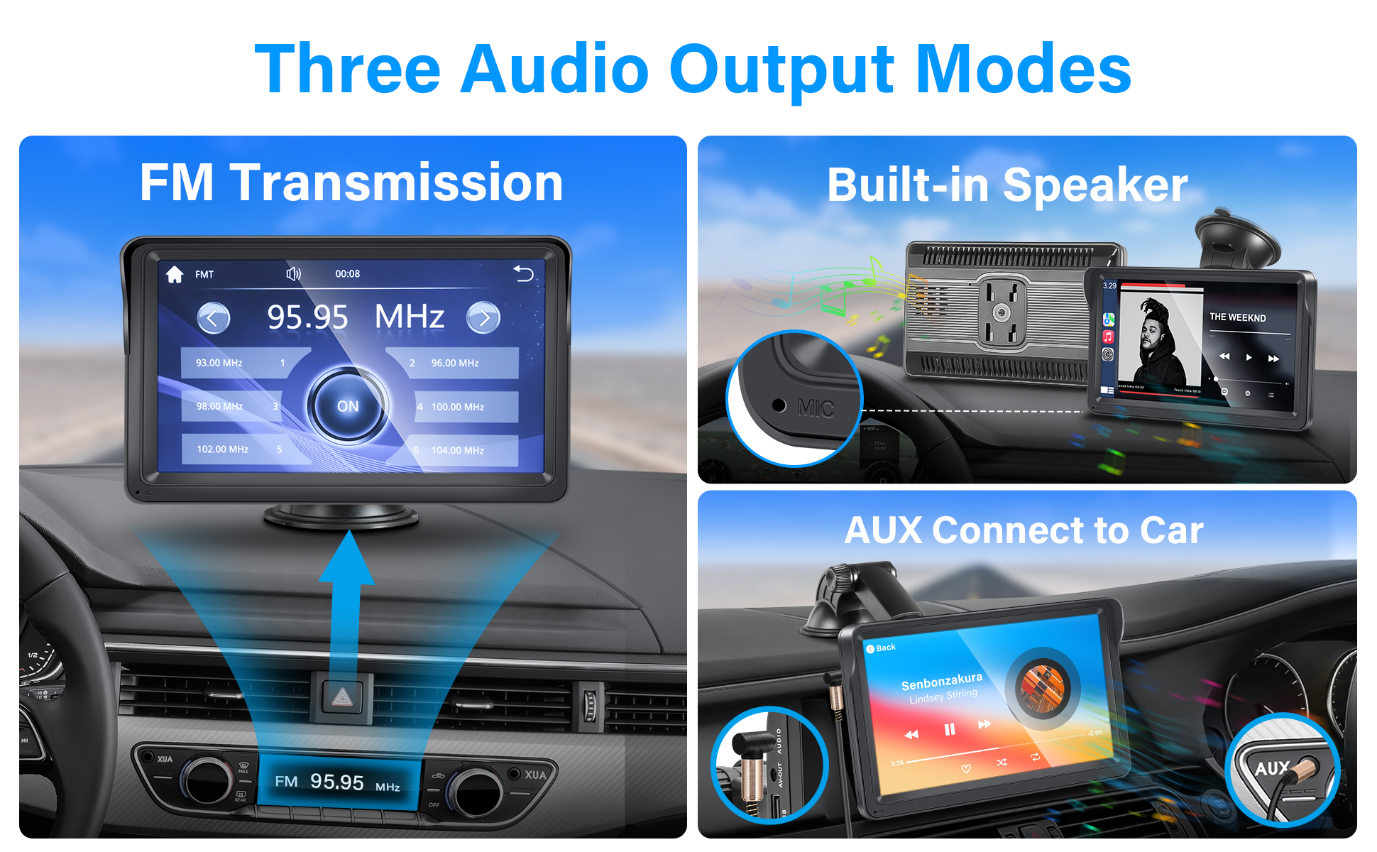 [FM/AUX لتشغيل الموسيقى] تحتوي أجهزة ستريو السيارة المحمولة على مكبرات صوت مدمجة، مما يجعل التحدث وتشغيل الموسيقى أسهل وأسرع. ولكن إذا كنت تريد صوتًا أعلى، فما عليك سوى ضبط الراديو المحمول وراديو السيارة الأصلي على نفس تردد FM، أو استخدم كابل AUX لتوصيل مقبس AUX الخاص بجهاز الاستريو المحمول بمدخل AUX في السيارة لنقل الصوت إلى مكبرات صوت السيارة. سيتم تشغيل كل الصوت من خلال مكبرات صوت السيارة.