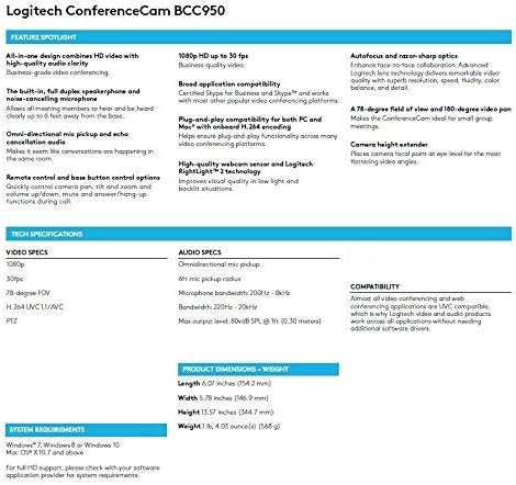 يجمع التصميم الشامل بين الفيديو عالي الدقة 1080 بكسل ووضوح الصوت عالي الجودة. صوت متعدد الاتجاهات وصوت إلغاء الصدى. التحكم عن بعد وخيارات التحكم في الزر الأساسي. مُحسّن لـ Microsoft Lync وSkype ويعمل مع معظم منصات الاتصالات الموحدة الشائعة الأخرى. تقنية UVC H.264 المدمجة ومتوافقة مع كل من أجهزة الكمبيوتر الشخصية وأجهزة Mac. ضبط تلقائي للصورة وعدسة ذات جودة كارل زايس. التقاط الفيديو: 1080p.