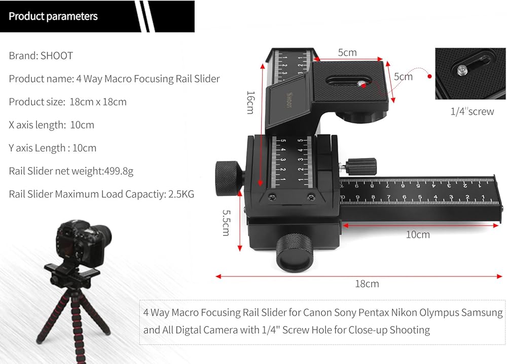 اللون: 4 طرق Rail Slider الخصائص: متوافق مع جميع العلامات التجارية، Canon, Nikon, Sony, Minolta, Olympus, Pentax, إلخ الكاميرات الرقمية والأفلام DSLR رفوف ناعمة وحركة البايون توفر تعديلات دقيقة للغاية يمكن قفلها في أي مكان. يستخدم هذا القضيب عالي الجودة لجميع الكاميرات الرقمية والأفلام DSLR مناسب لـ: NIKon D4/D3X/D3S/D3,D800/D800E/D700/D300S/D300, D2X/D2H/D200,D1H/D1X/D100,D7000/D5100/D5000/D3200/D3100/D3000, D90/D80/D70/D60/D50/D40 for Canon1D/1DsSeries,7D/5D/D3000, D90/D80/D80/D70/D70/D70/D60/D50/D40 MarkII/5DMark III, 1100D/1000D/60D/50D/40D/30D/20D/10D, 600D/550D/500D/450D/400D/350D/300D For Sonya100/a200/a230/a290/a300/a330/ a350/a380/a390/a450, a500/a550/a560/a580/a700/a750/a850/a900، Mina33/a65/a77 For كاميرات سلسلة: a5/a5D, a7/a7D, إلخ. لسلسلة Pe-tax K-5/K-7/K-X/K-R/K10D/K20D/K100D/K200D لسيارات Olymp-s E-1/E-3/E-30/E-620/E-610/E-520/E-510/ E-500/E-450/E-420/E-410/E-330/E-300 لسيارات Fuj-i S5Pro/S3Pro/S2Pro/S1Pro لـ Samsu-g GX-20/GX-10 لسلسلة GF1/GH1/L1/L1/L10