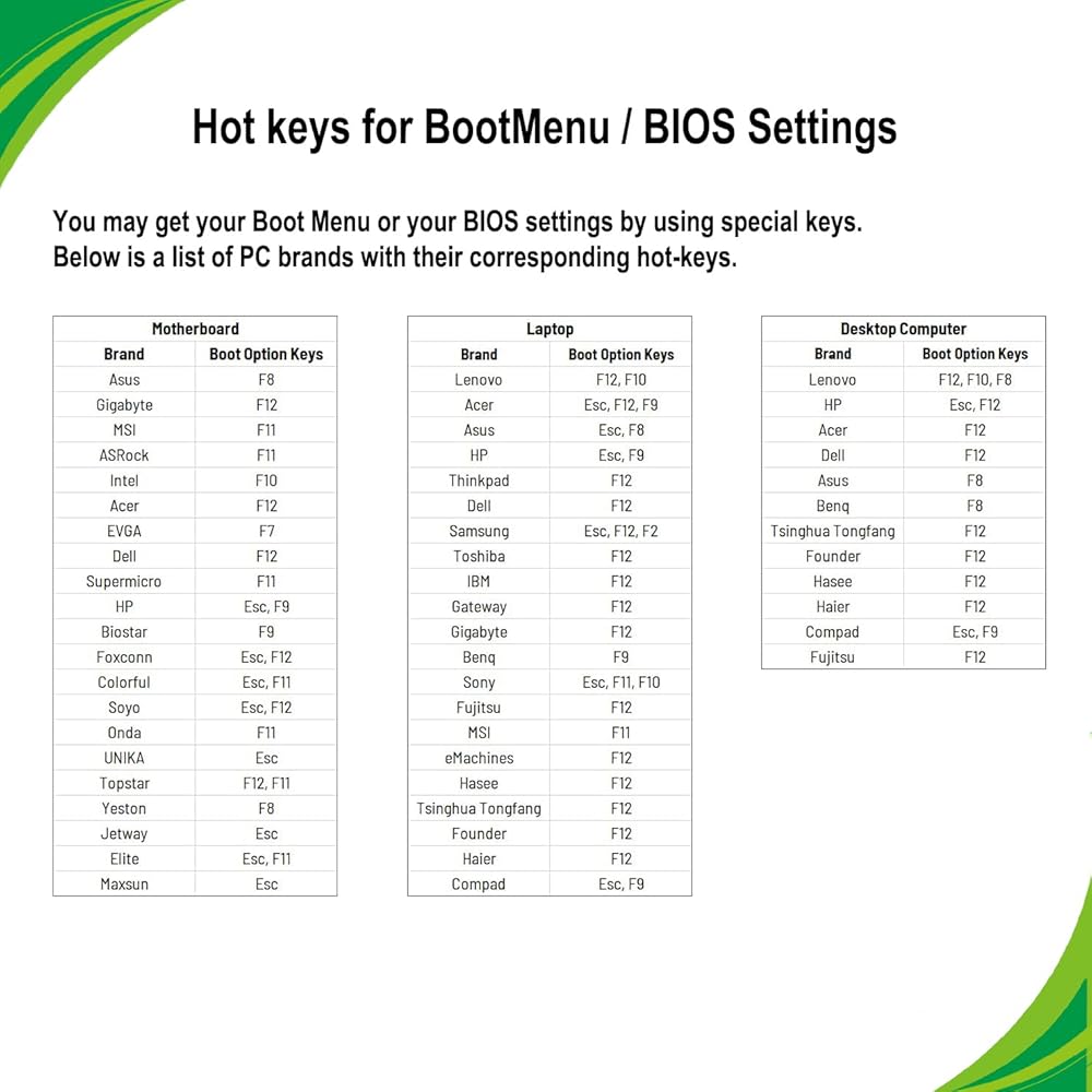 2. تأكد من ضبط تسلسل التمهيد على التمهيد من محرك أقراص USB أولاً، إذا كنت بحاجة إلى إدخال BIOS لتغيير ترتيب التمهيد أو إعدادات النظام الأخرى، فسيكون المفتاح واحدًا مما يلي: ESC أو F1 أو F2 أو F10 أو F12 حسب الشركة المصنعة لجهاز الكمبيوتر الخاص بك.