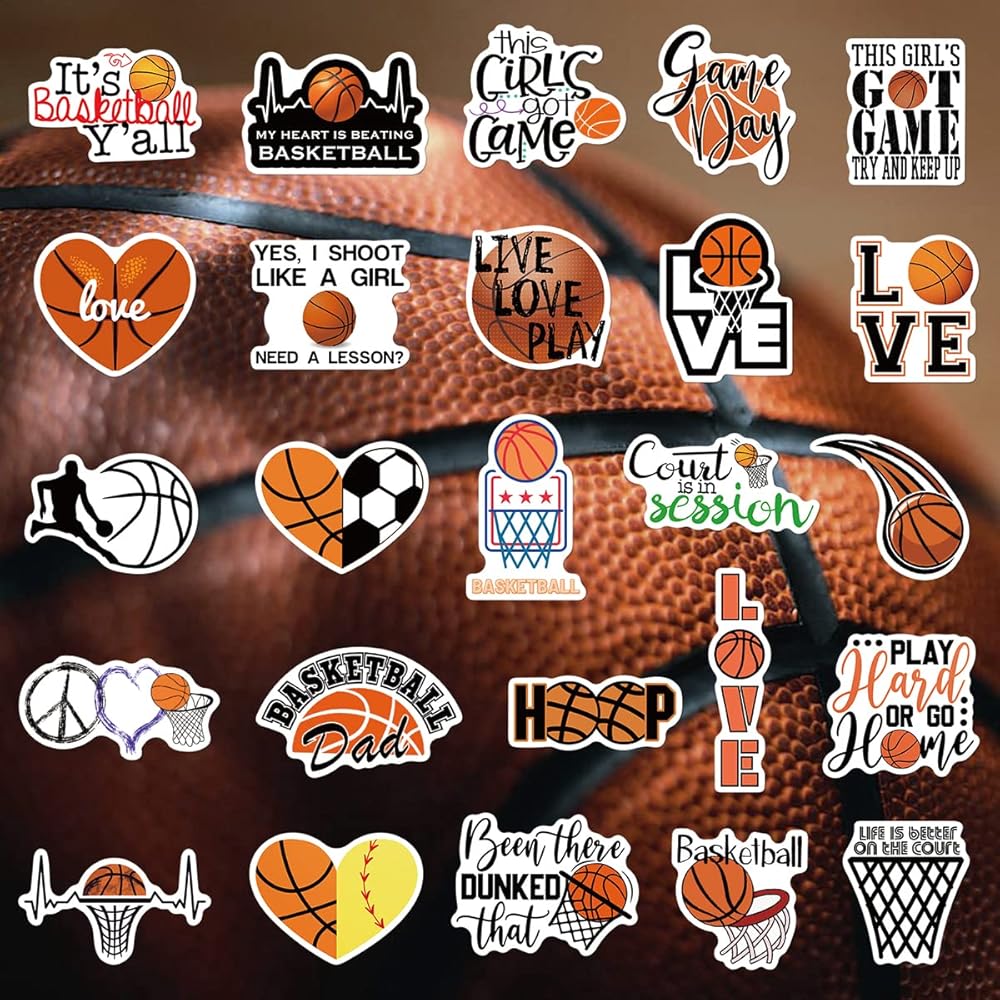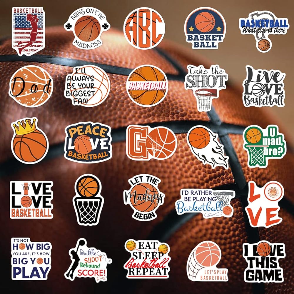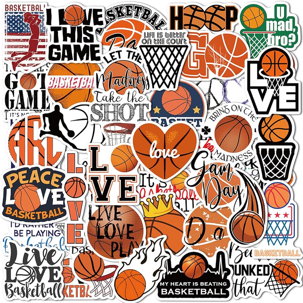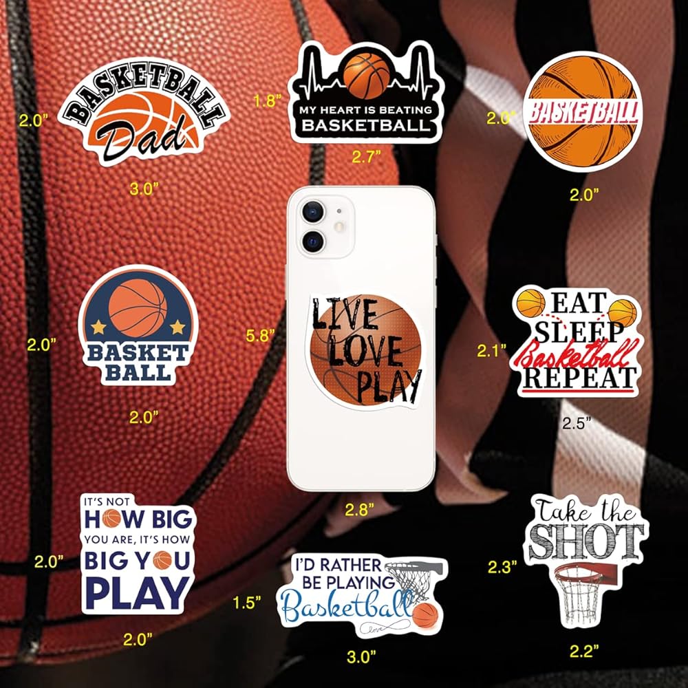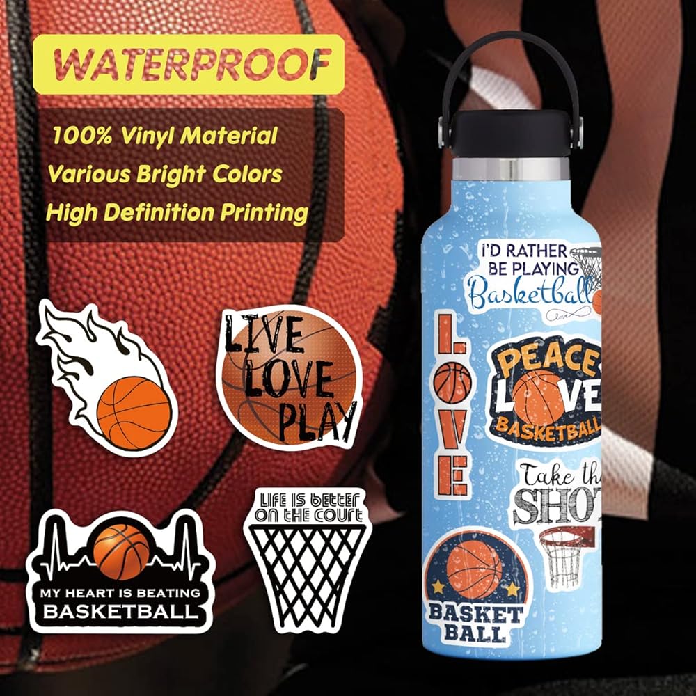ملصقات كرة السلة 50 قطعة من إكسسوارات كرة السلة هدايا للفتيات/الأولاد، ملصقات كرة لينة من الفينيل مقاومة للماء لزجاجة المياه قارورة مائية للكمبيوتر المحمول والجيتار والكمبيوتر ولوح التزلج وكأس الهاتف والأمتعة