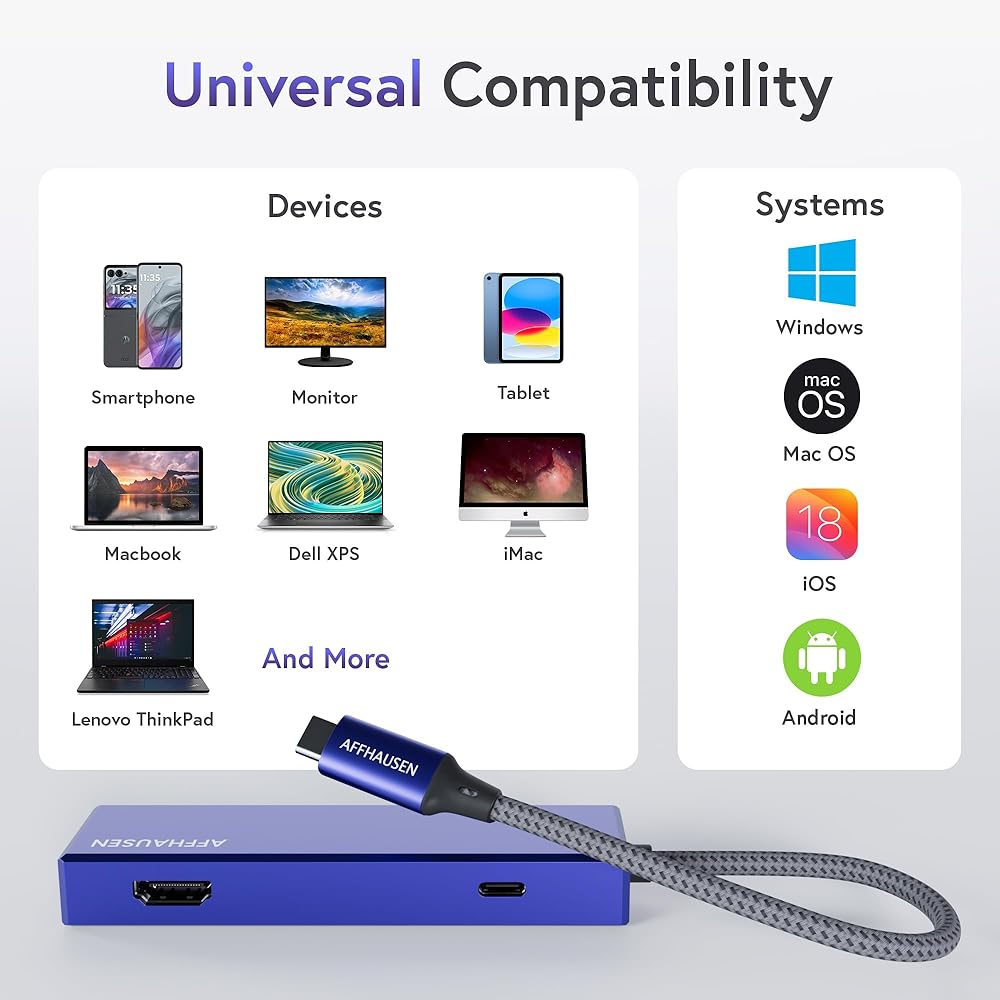 • 𝐖𝐢𝐝𝐞𝐥𝐲 𝐂𝐨𝐦𝐩𝐚𝐭𝐢𝐛𝐢𝐥𝐢𝐭𝐲: تدعم محاور AFFHAUSEN USB-C جميع USB-C (النوع-C) تقريبًا. متوافق مع مجموعة واسعة من أجهزة USB-C، بما في ذلك iPhone 15 وiPad Pro وMacBook Pro وSurface وXPS وGalaxy وغيرها الكثير.