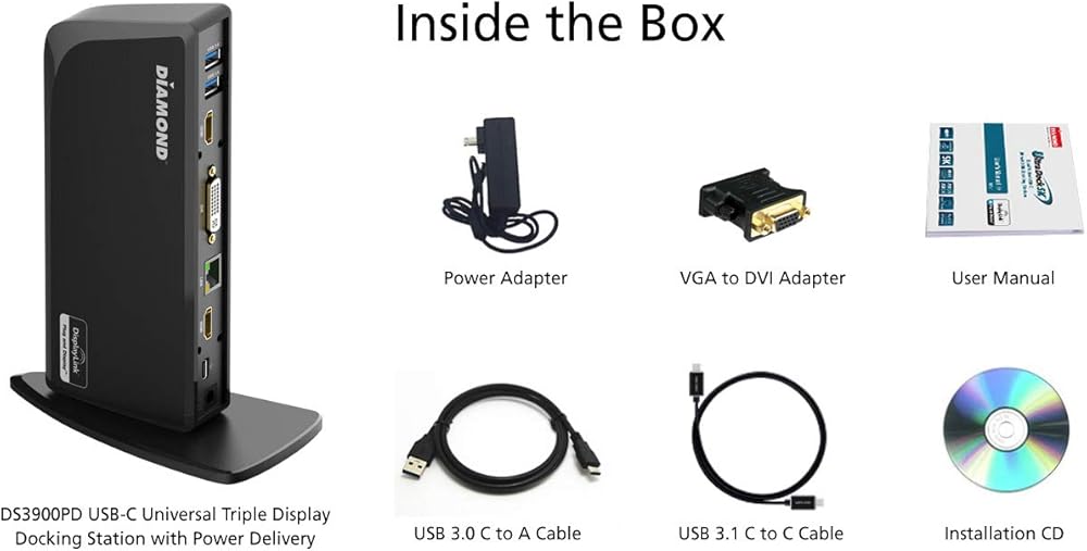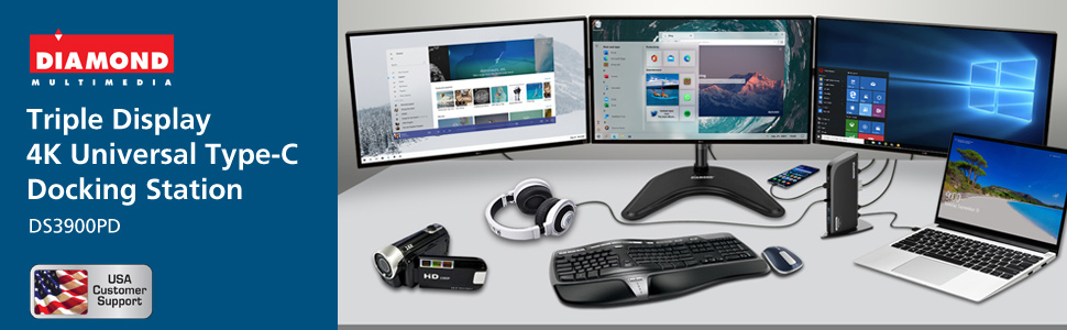 محطة إرساء Diamond Multimedia DS3900PD Diamond Multimedia Triple Display 4K Universal Type-C مع توصيل الطاقة (65 وات) لأجهزة الكمبيوتر المحمولة Mac وWindows المجهزة من النوع C/Thunderbolt 3