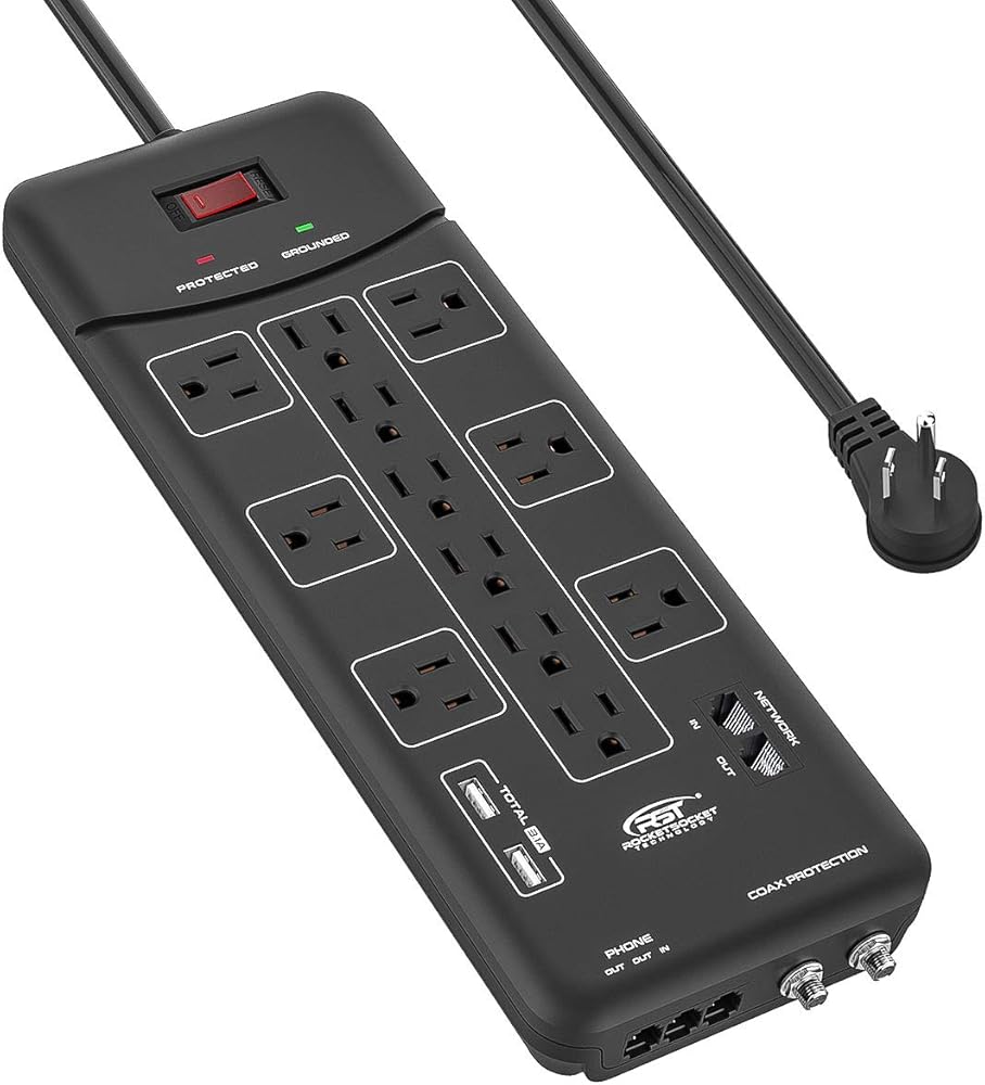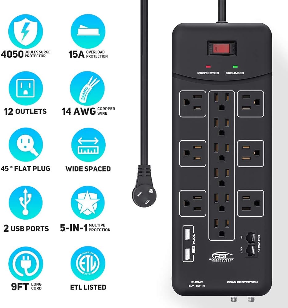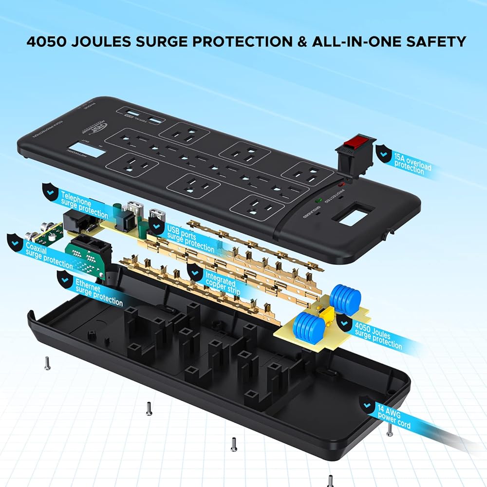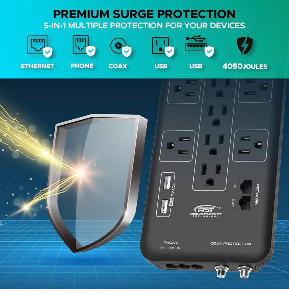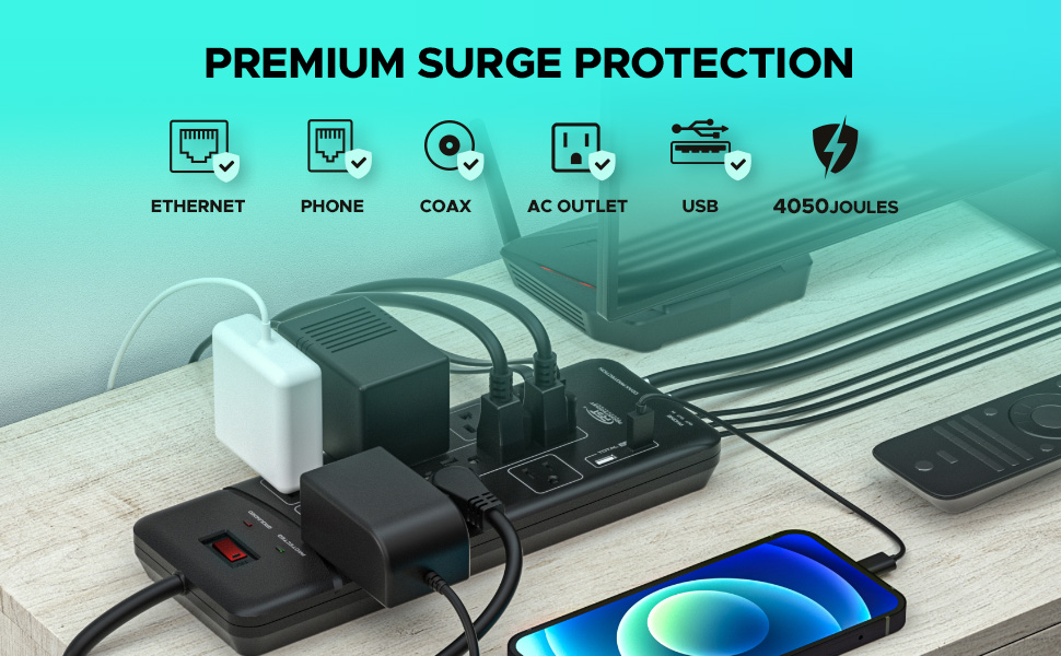 • [حماية ممتازة من 4050 جول الكل في واحد وفلتر EMI]: حماية من اندفاع التيار المحوري/الهاتف/الإيثرنت، توفر حماية فائقة للاستخدام اليومي في المنزل والمكاتب وورش العمل وحماية التلفزيون وأجهزة الكمبيوتر وأجهزة استقبال الكابلات/الأقمار الصناعية والهواتف / الفاكسات / DSL ومودم الكابل والطابعات وأجهزة الاستريو ومشغلات الأقراص المضغوطة / أقراص DVD. والأجهزة الإلكترونية الأخرى من العواصف الضارة وتقلبات الجهد وارتفاع الضوضاء.