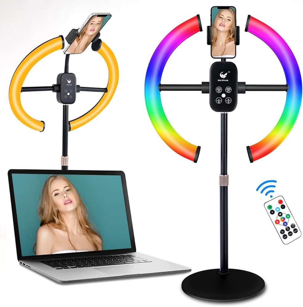 ضوء حلقة سطح المكتب من Oldshark RGB للكمبيوتر المحمول، ضوء سيلفي دوار مقاس 12 بوصة مع حامل معدني وحامل هاتف، إضاءة لمكالمات التكبير ومؤتمرات الفيديو والاجتماعات الافتراضية وإضاءة كاميرا الماكياج