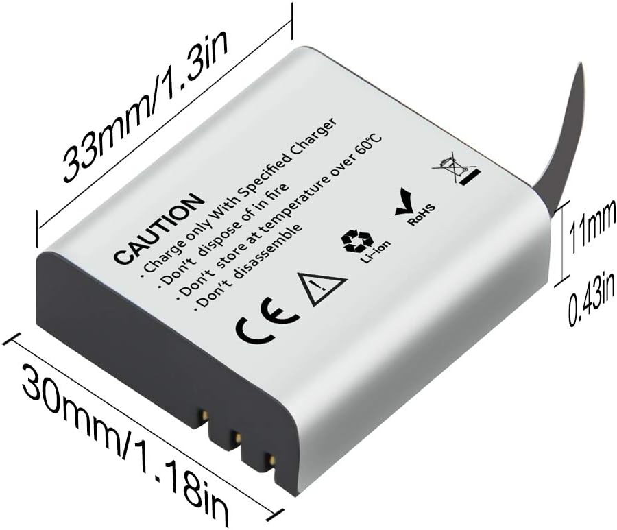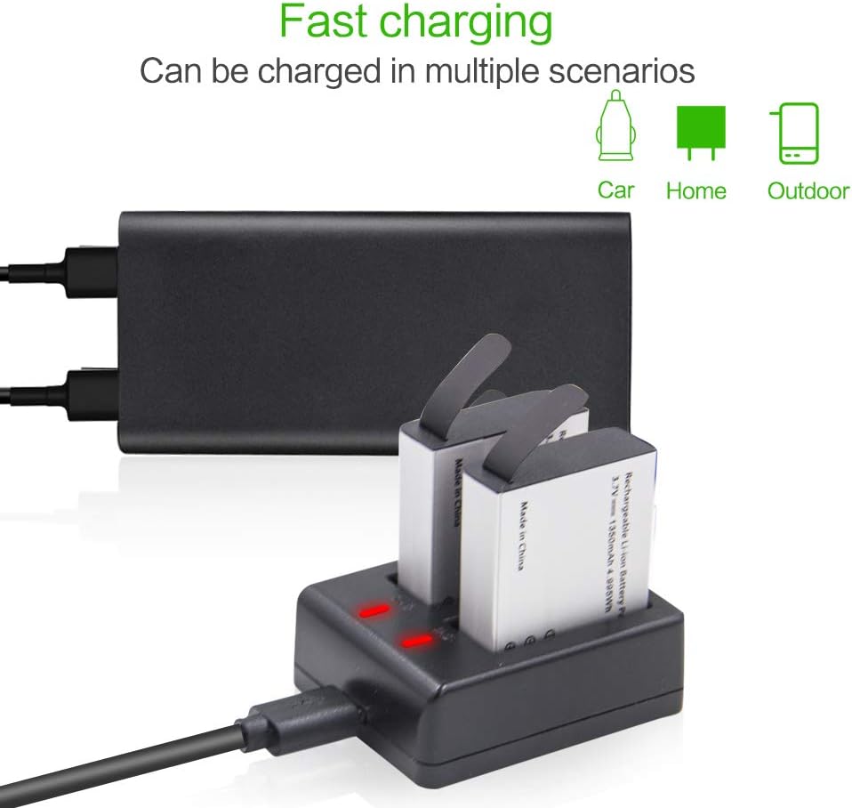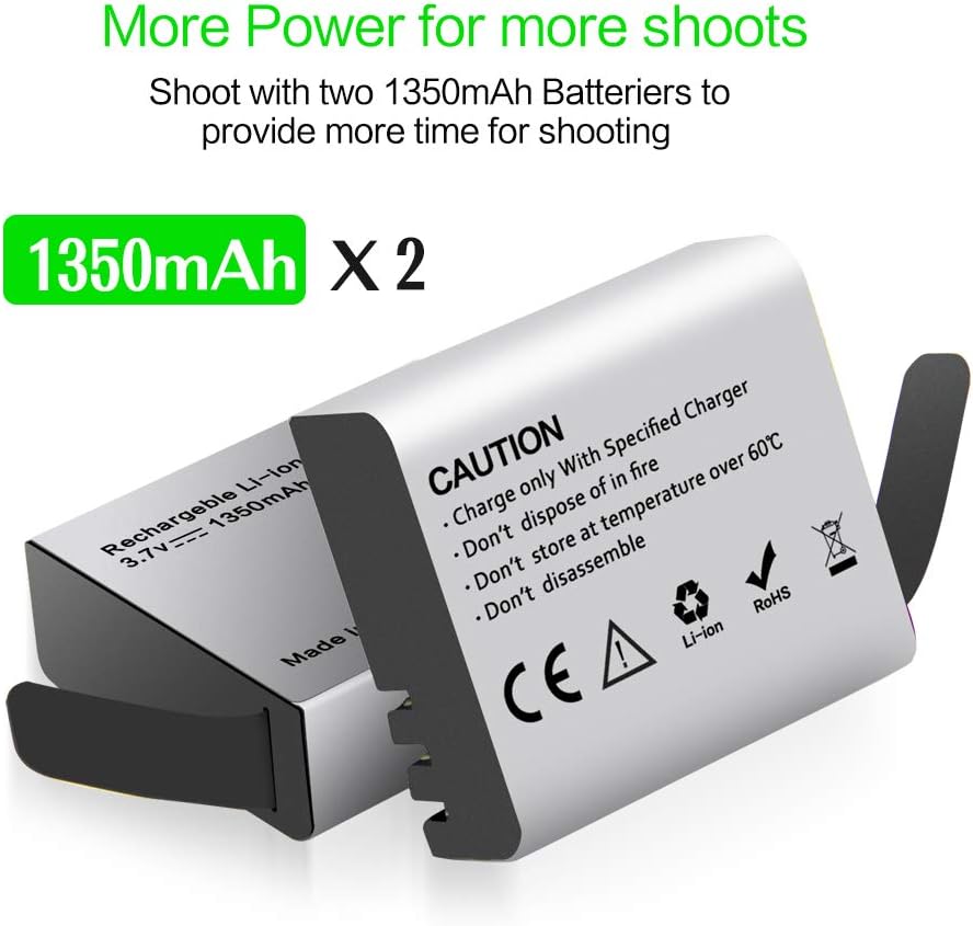 【سعة أعلى】 تعد بطارية كاميرا الحركة القابلة لإعادة الشحن بقدرة 1350 مللي أمبير في الساعة ملحقًا ضروريًا للكاميرا الرياضية الخاصة بك. سعتها أعلى بنسبة 30% من قدرة البطارية التي تبلغ 900 مللي أمبير في الساعة، مما يعني تمديد وقت تسجيل كاميرا الحركة الخاصة بك بنسبة 30%. لقد أعددنا لك بطاريتين بسعة 1350 مللي أمبير في الساعة، حتى لا تفوت أي لحظات رائعة أبدًا.