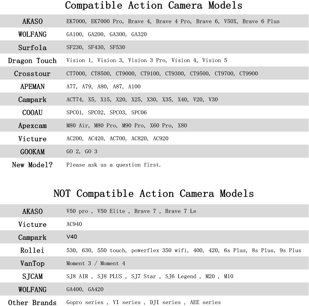 توافق واسع: متوافق مع AKASO EK7000/Dragon Touch/Campark/Crosstour/APEMAN/EKEN/DBPOWER/BOIFUN/Davola/JEEMARK/TENKER/COOAU/GeeKam/Apexcam/BOIFUN/Lightdow/SJ4000/PG1050/PG900/S009R، يرجى التحقق وصف المنتج للنموذج التفصيلي.
