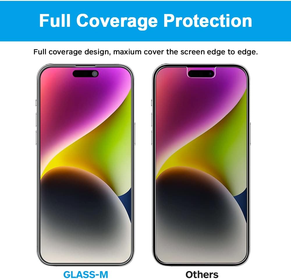 FULL COVERAGE DESIGN: GLASS-M full coverage tempered glass screen cover providing edge to edge maximum protection by covering your whole screen and does not affect the smooth use of the dynamic island.