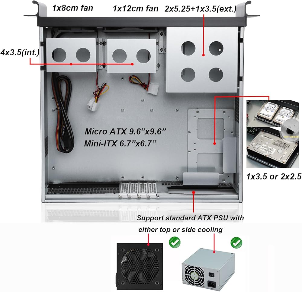هيكل الخادم RackChoice 3u ذو العمق القصير، Micro ATX/Mini-itx 2x5.25+5x3.5 يدعم معيار ATX PSU مع التبريد العلوي أو الجانبي