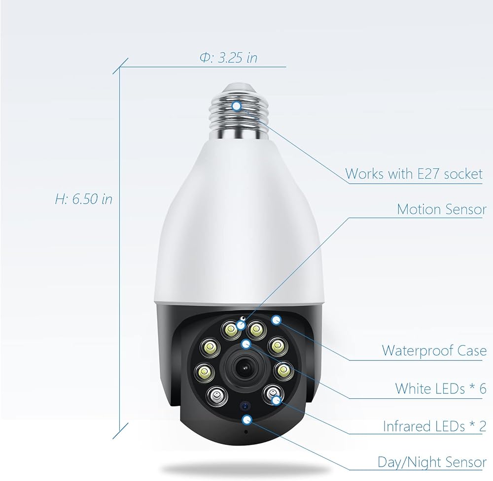 ➽ سهولة التركيب والإعداد ➽ التثبيت سهل مثل استبدال المصباح الكهربائي، وخالي من الحفر، وخالي من الثقب، وخالي من الأسلاك! يعمل مع مقبس الإضاءة E27، إعداد Wi-Fi لمدة دقيقتين بسرعة 2.4 جيجا هرتز!