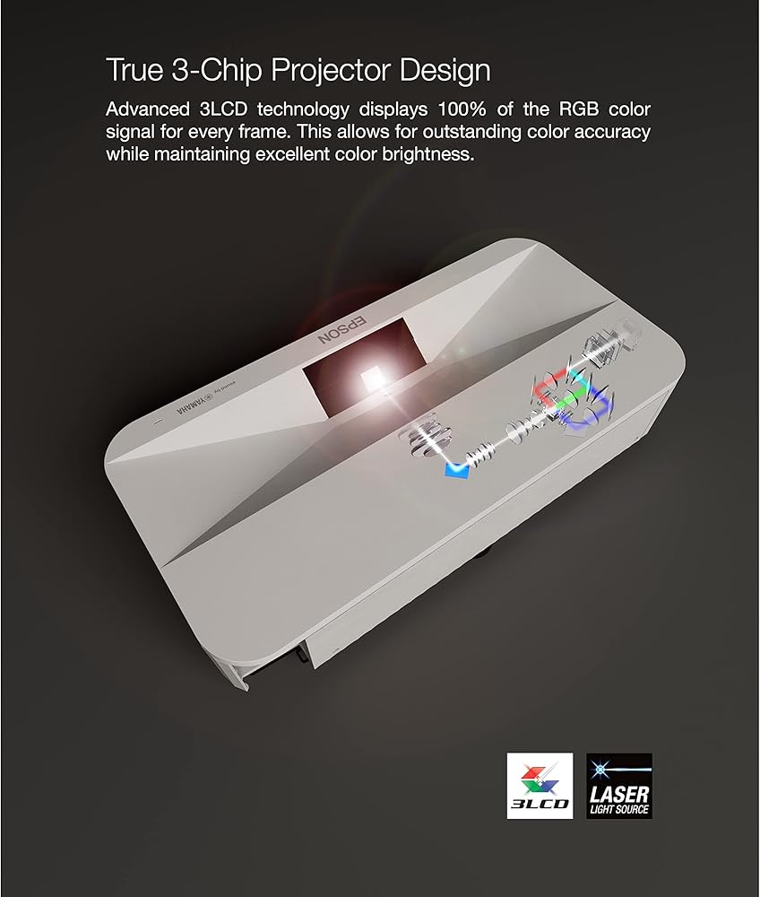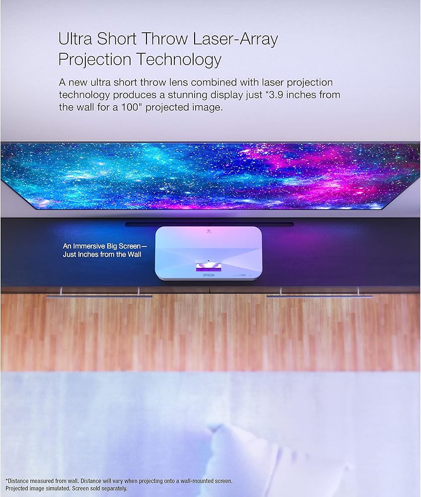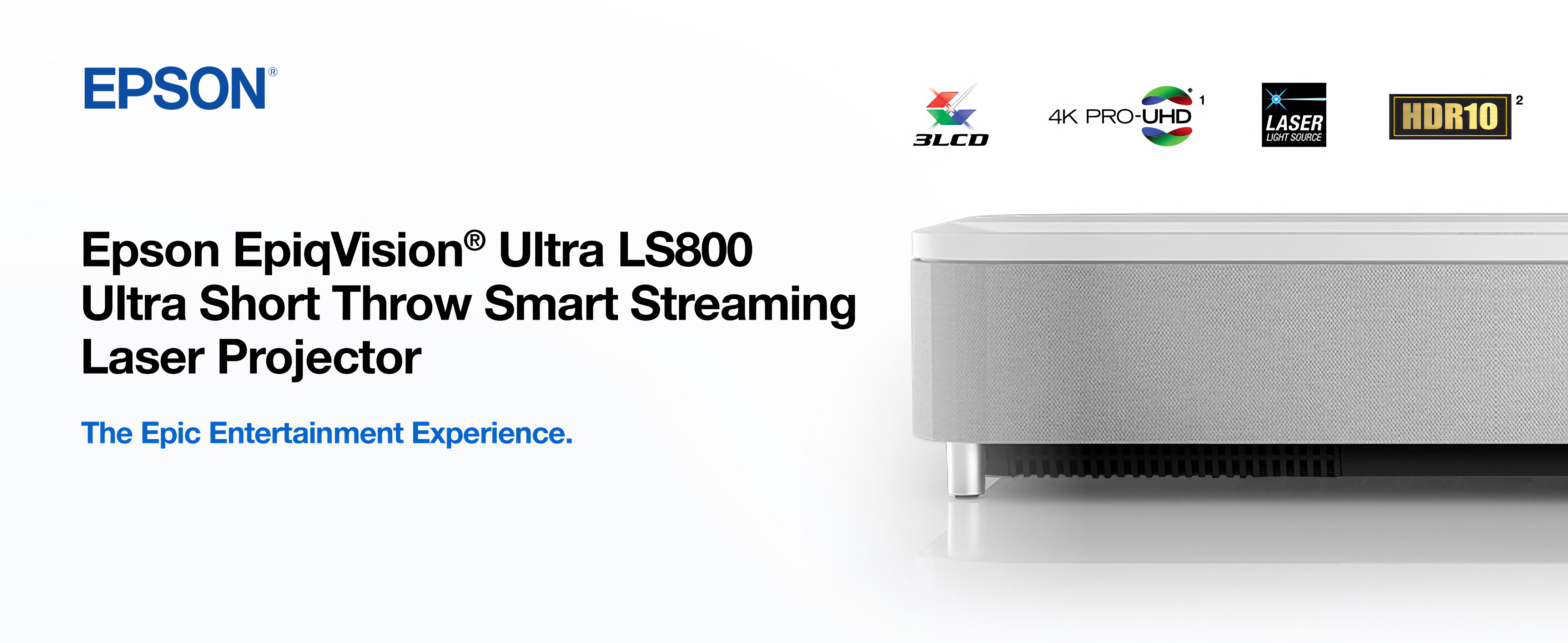 مزودًا بتقنية 4K PRO-UHD (2)، وتقنية 3LCD ثلاثية الشرائح و4000 لومن من الألوان والسطوع الأبيض (3)، يجمع جهاز العرض الليزري EpiqVision Ultra LS800 بين عدسة رمي قصيرة جدًا متقدمة ومصدر ضوء مصفوفة ليزر - إلى جانب شاشة Epson SilverFlex® Ultra الاختيارية عالية الدقة التي ترفض الضوء المحيط (4) - لإنتاج ألوان زاهية وألوان سوداء عميقة للحصول على صورة مشرقة وملونة وحادة بشكل استثنائي في أي بيئة عرض تقريبًا - حتى في الغرف ذات الإضاءة الساطعة.