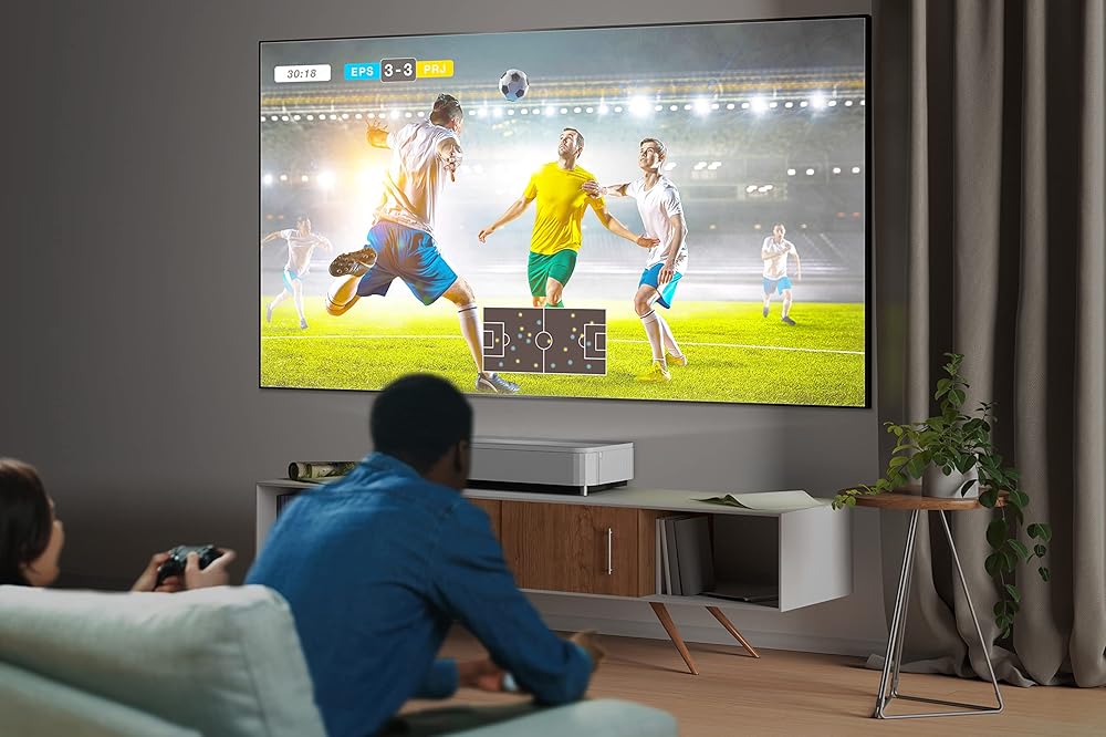 أفضل طريقة لمشاهدة الألعاب الرياضية، جهاز العرض الليزري Epson EpiqVision Ultra LS800 3-Chip 3LCD Smart Streaming Laser ينتج صورة أكبر من الحياة يصل حجمها إلى 150 بوصة للحصول على تجربة مذهلة بدقة 4K HDR (1).
