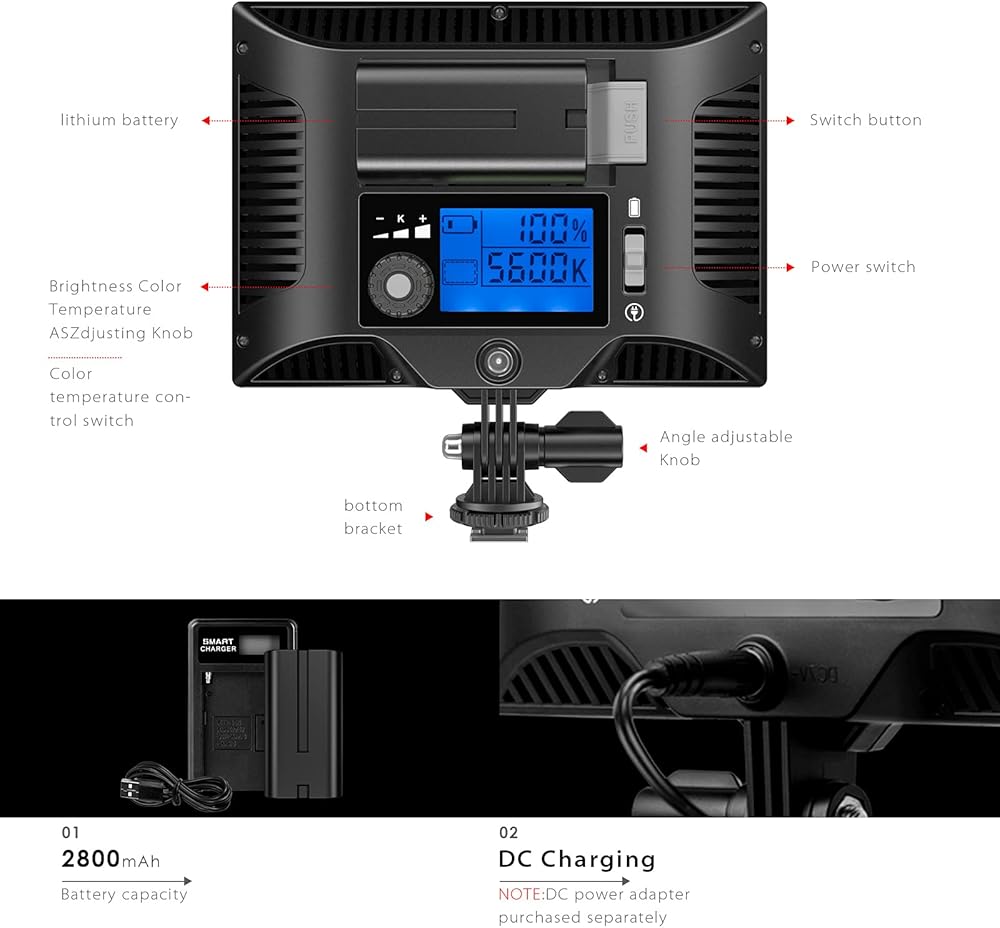 【شاشة ال سي دي】لوحة إضاءة ليد مع شاشة ال سي دي على الجزء الخلفي من الضوء، تظهر بوضوح حالة درجة حرارة اللون والسطوع وطاقة البطارية، مما يجعلها مريحة للتحكم في التصوير الحالي والعمل بفعالية.
