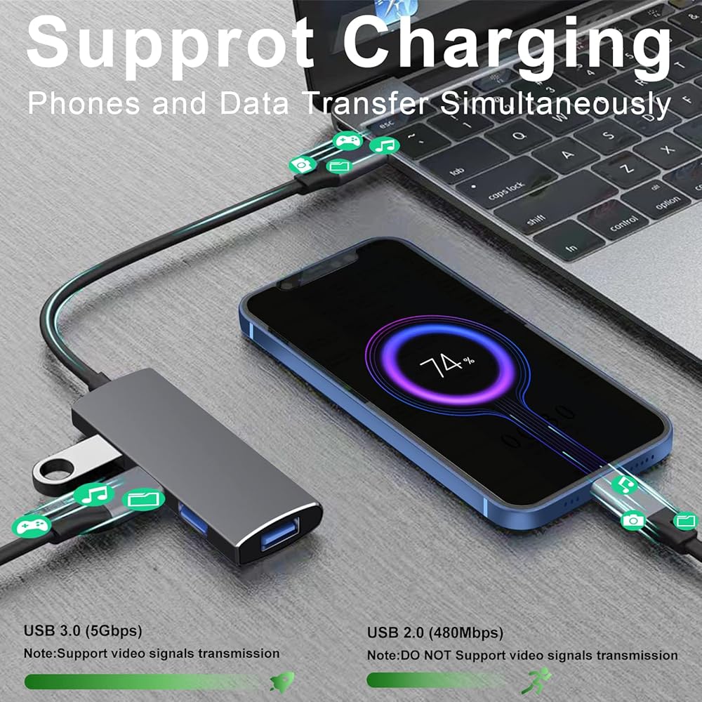 [سرعة نقل بيانات عالية]: يدعم محول USB C متعدد المنافذ هذا نقل البيانات بسرعة فائقة تصل إلى 5 جيجابايت في الثانية (في USB 3.0)، ويدعم سرعة نقل البيانات 480 ميجابايت في الثانية (في USB 2.0)؛ يلبي محور USB متطلبات توسيع المنافذ المتعددة لـ الجهاز. محرك أقراص فلاش USB، ماوس، لوحة مفاتيح، شحن (يتم دعم الحد الأقصى لكفاءة الشحن 5 فولت/3 أمبير فقط)