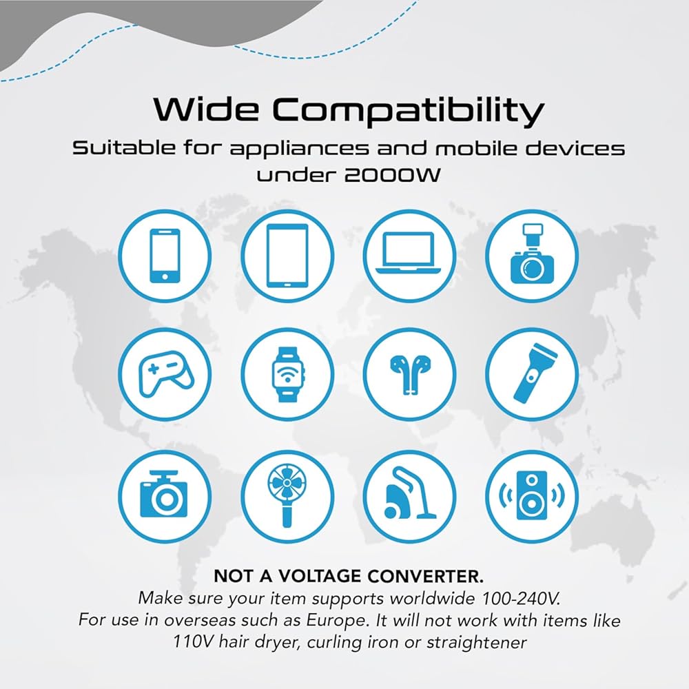 ملاحظة مهمة: هذا المحول ليس محول جهد كهربائي، ولن يقوم بتحويل الجهد الكهربي، تأكد من أن العنصر الخاص بك يدعم جميع أنحاء العالم 100-240 فولت للاستخدام في الخارج مثل أوروبا، ولن يعمل مع عناصر مثل مجفف الشعر 110 فولت، ومكواة تجعيد الشعر أو مكواة فرد الشعر، ودعم كامل للمصابين بالمرض اتصل بنا لأية أسئلة