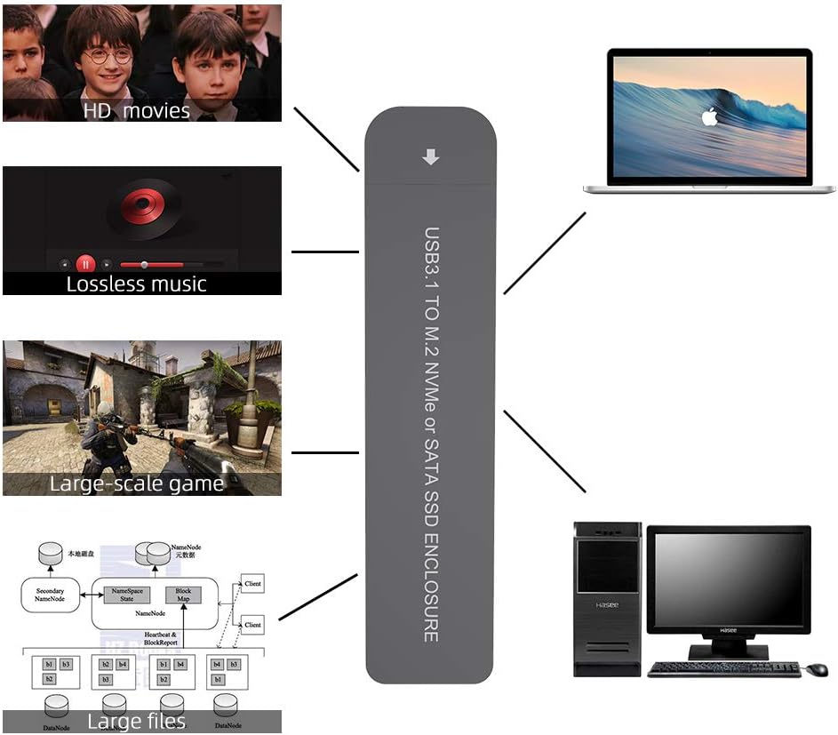 【Solution RTL9210B】 NVME SATA SSD Enclosure has strong compatibility, supports USB 2.0 / USB 3.1 Gen 1/2, supports Windows 7/8/10 & MAC 10.10.5 and above, the transfer speed depends on your SSD and USB port type.