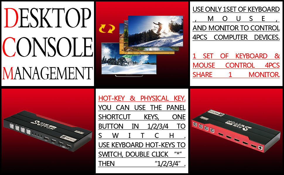توافق قوي: يدعم محول HDMI استخدام مجموعة من لوحات المفاتيح والماوس USB للتحكم في أربعة أجهزة كمبيوتر HDMI، ويدعم لوحات المفاتيح والفئران اللاسلكية/السلكية. Unix/Windows/Debian/Ubuntu/دعم/تشغيل MAC OS X/Raspbian وأنظمة Linux الأخرى Fedora Ubuntu Raspberry Pi