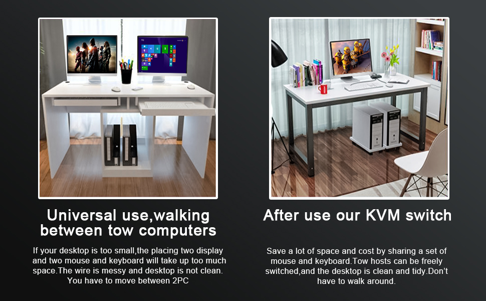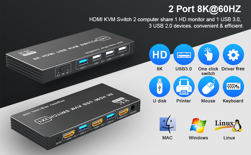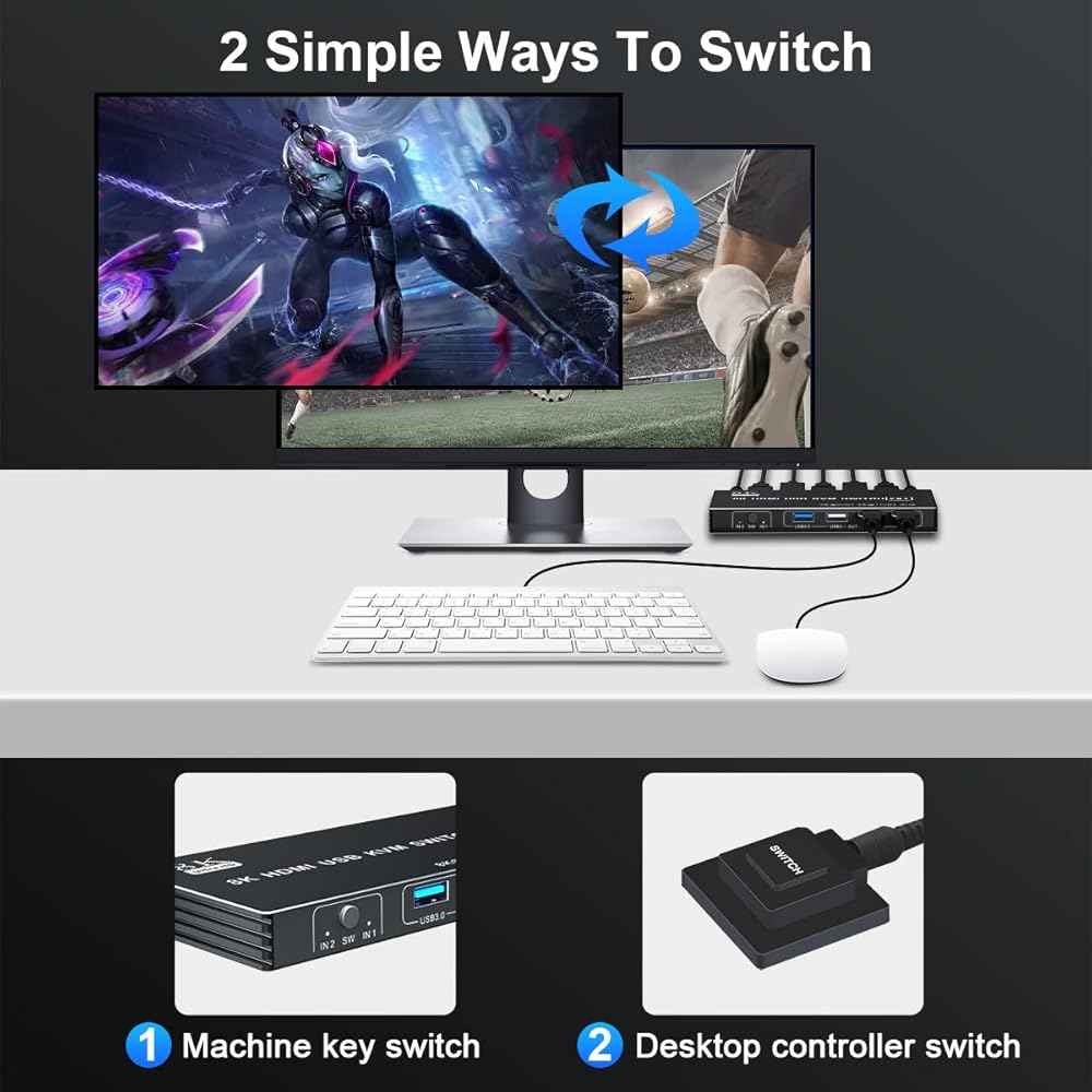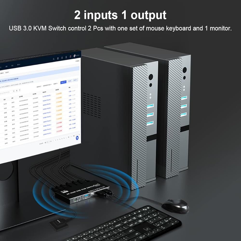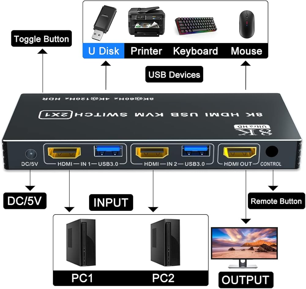 مفاتيح 8K 2 IN 1 Out HDMI KVM: يساعدك صندوق المنفذ 8K HDMI KVM 2 على تحقيق مجموعة واحدة من التحكم في لوحة المفاتيح والماوس، قطعتان تشاركان شاشة واحدة، الحد الأقصى لعرض الدعم: 8K 60 هرتز. (ملاحظة: إذا كنت تريد دعم KVM هذا 8K@60 هرتز، فيرجى التأكد من أن جميع أجهزتك تدعم هذه الدقة العالية). التبديل بين قطعتين بواسطة مفتاح الزر الموجود على اللوحة، مريح جدًا وسريع، مثالي للاستخدام المنزلي أو الاستخدام المكتبي أو الشخصي studio. ملاحظة: مفتاح KVM هذا بدون مفتاح التشغيل السريع.