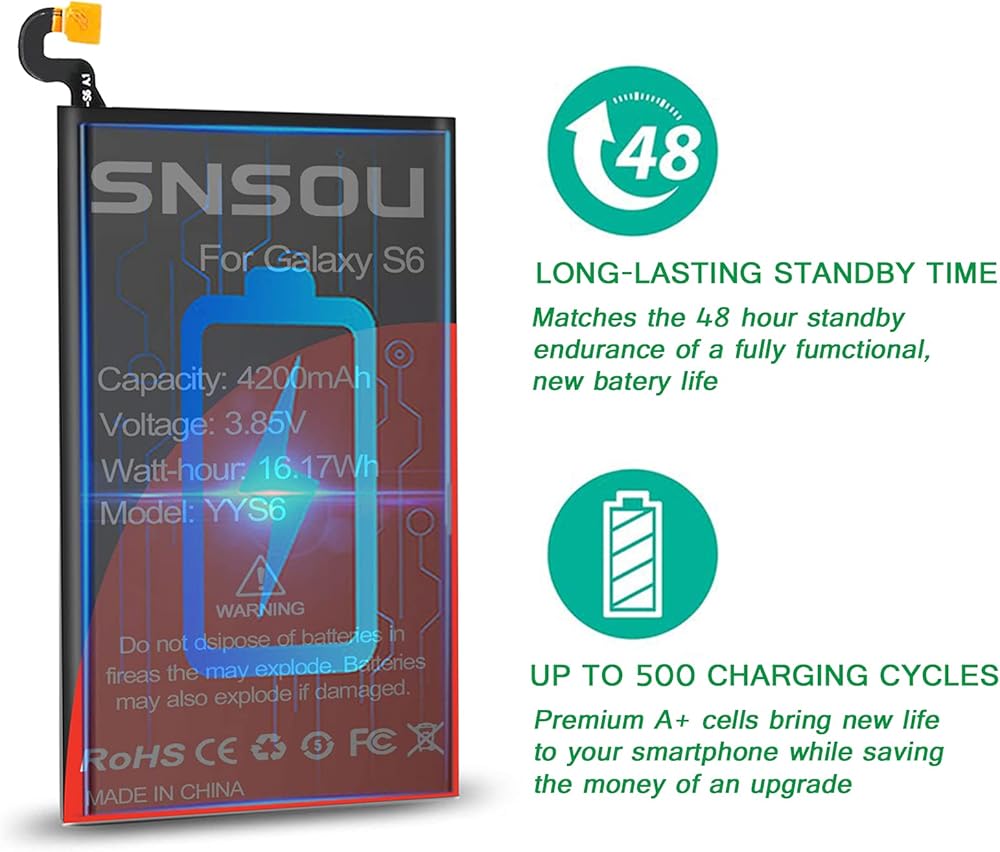 بطارية بديلة ذات سعة فائقة تبلغ 4200 مللي أمبير في الساعة لهاتف Galaxy S6 فقط، حاصلة على شهادات الجودة CE وFCC وROHS.