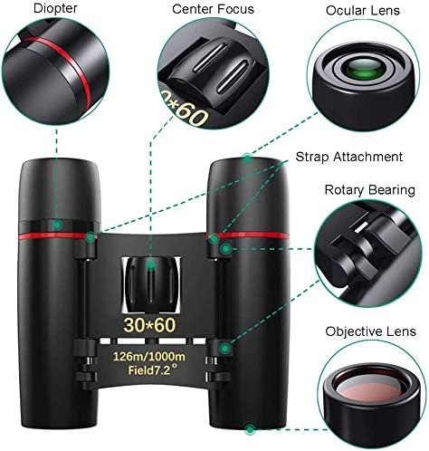 مناظير صغيرة الحجم 30×60، مناظير صغيرة قابلة للطي مع رؤية ليلية، عدسة كبيرة سهلة التركيز للاطفال والكبار لمشاهدة الطيور والسفر والصيد والحفلات الرياضية، تلسكوب مقاوم للماء مع شنطة حزام (اسود)