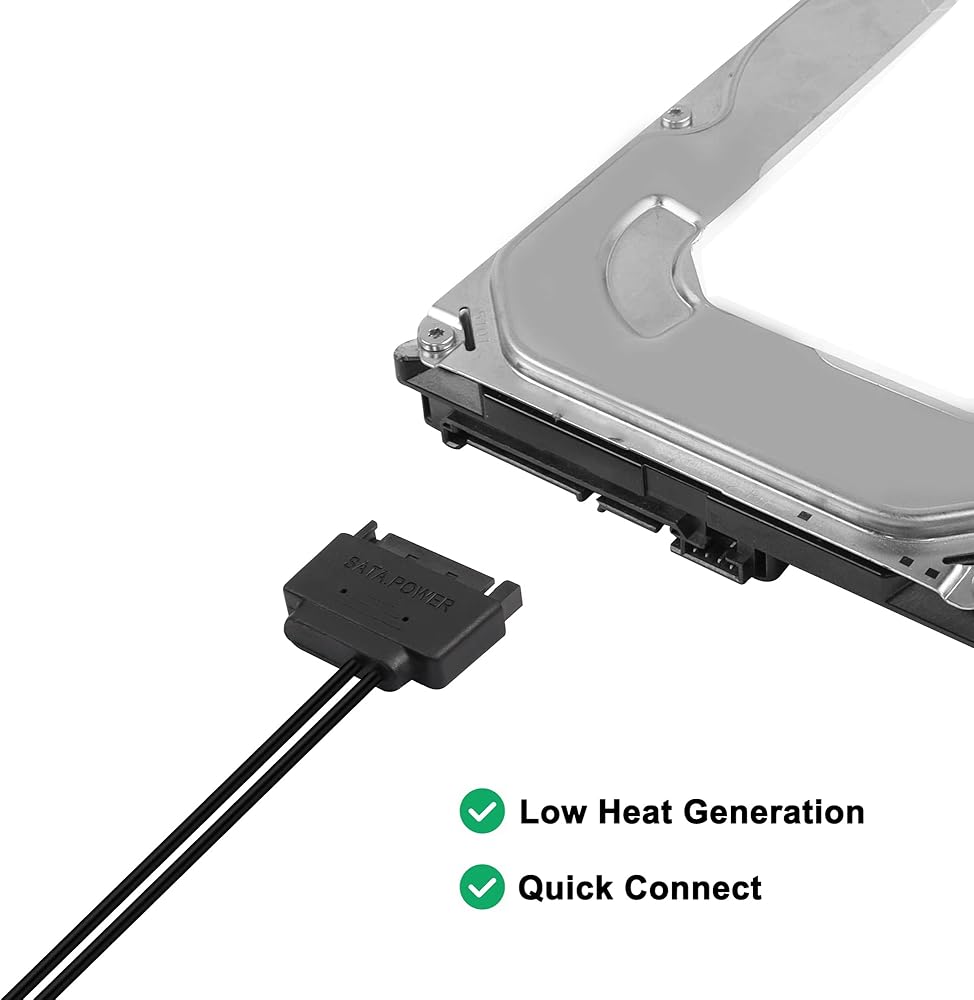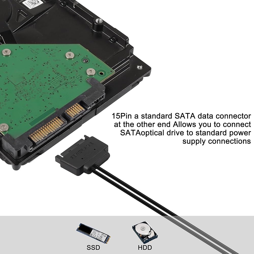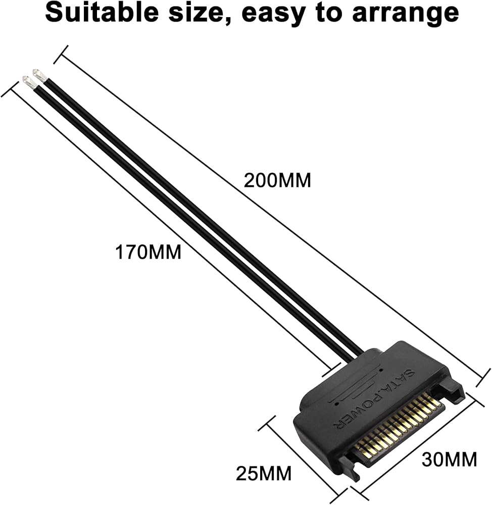 تسمح لك كابلات توزيع الأسلاك العارية SATA ذات 15 سنًا إلى 12 فولت باستخدام أسلاك طاقة SATA لتشغيل الأقراص المضغوطة الضوئية أو محركات أقراص DVD أو محركات الأقراص الصلبة SATA فائقة الرفع.