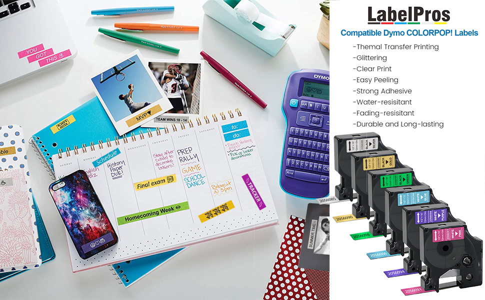 [نطاق واسع من التطبيقات]: أضف لمسة شخصية إلى أي شيء تقريبًا باستخدام DYMO COLORPOP! الملصقات، متوفرة في مجموعة واسعة من الألوان الزاهية واللامعة. استخدمه مع DYMO COLORPOP! صانع الملصقات لطباعة رسائل مخصصة باستخدام الرموز التعبيرية، وهو مثالي للالتصاق على حافظات الهاتف والدفاتر والمخططات وسجلات القصاصات وتزيين الهدايا والمزيد. إضفاء الطابع الشخصي على الأشياء الخاصة بك وتخصيصها بطريقة جديدة وممتعة!