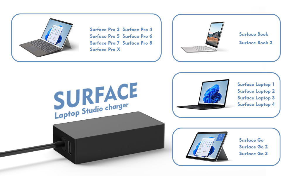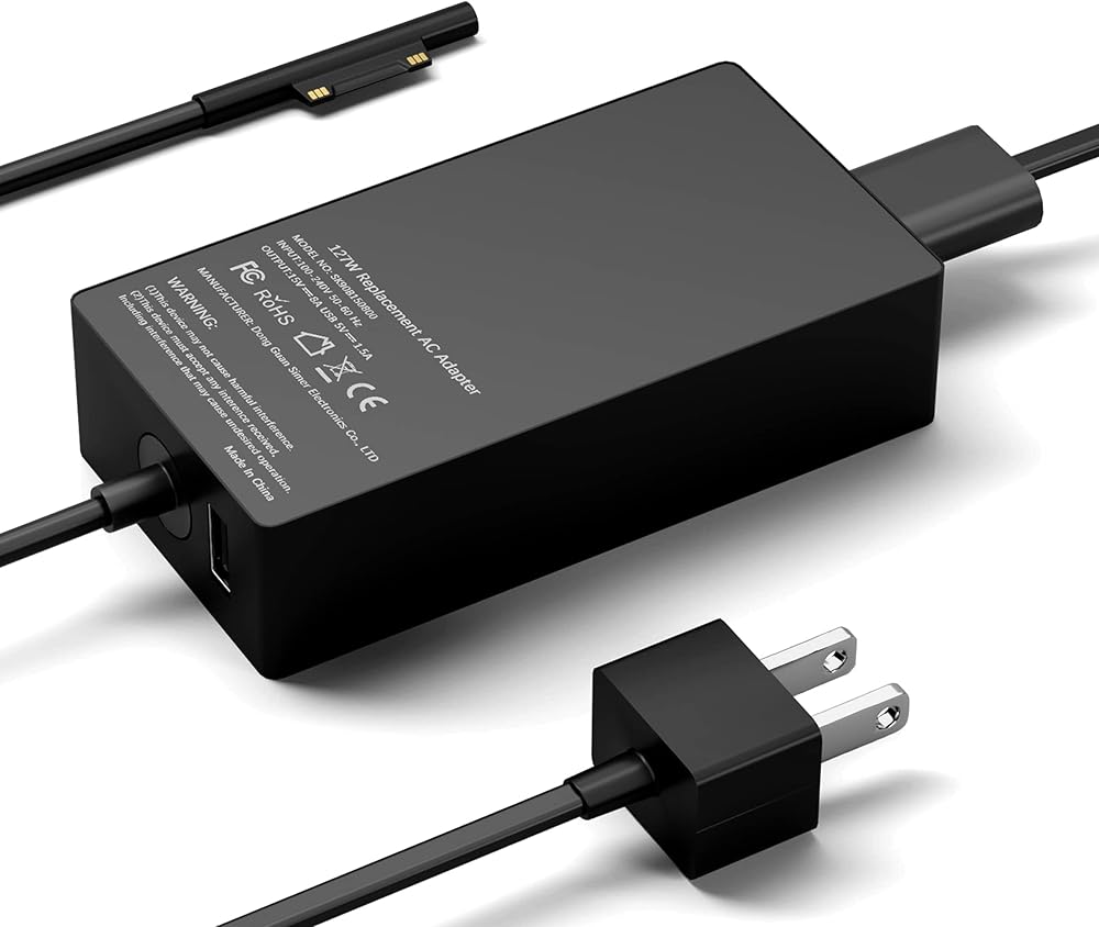 • شاحن Microsoft Surface بقدرة 127 وات متوافق مع شاحن Surface Book 3 متوافق مع Surface Book 3 وSurface Book 2 وSurface Book (الجيل الأول)، وSurface Laptop 4، وSurface Laptop 3، وSurface Laptop 2، وSurface Laptop (الجيل الأول)، وSurface Pro X، وSurface برو 7، سيرفس برو 6، سيرفس برو (الجيل الخامس)، سيرفس برو 4، سيرفس برو 3، سيرفس جو 2، سيرفس جو (الجيل الأول).
