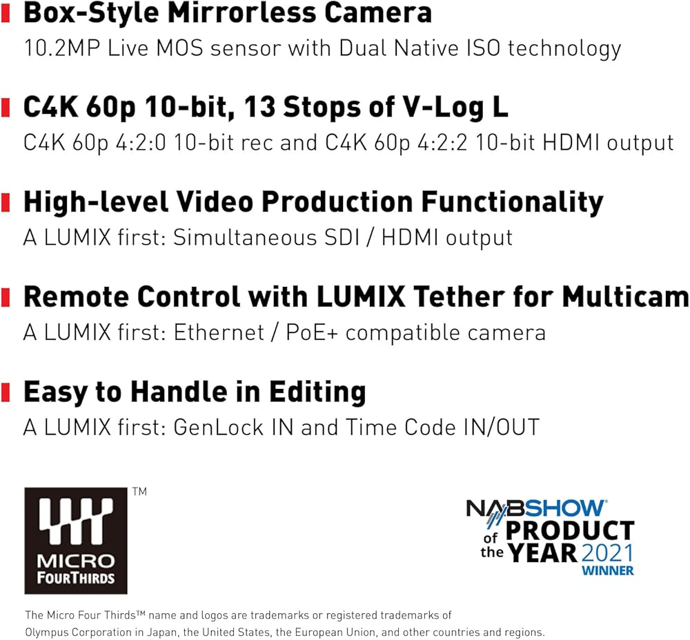 يدمج لوميكس BGH1 مستشعر ام او اس لايف عالي الحساسية 10.2 ميجابكسل مع تقنية ايزو الأصلية المزدوجة، مما يوفر دائرتين من ايزو الأصلي المنفصل لتقليل توليد الضوضاء. ونتيجة لذلك، يتم تحقيق الحد الأقصى للتسجيل في ISO 51200. تتيح الكاميرا تسجيل فيديو داخلي 10 بت C4K 60p مع V-Log L المثبت مسبقًا مع 13 نقطة توقف من النطاق الديناميكي. كما أنه قادر على إخراج C4K 4:2:2 10 بت عبر HDMI. يتيح لك معدل الإطارات المتغيرة في اف ار تسجيل فيديو مفرط الكرنك / تحت الذراع في C4K/4K (60 إطار في الثانية، بحد أقصى 2.5 مرة أبطأ في 24 بكسل) ودقة FHD (240 إطار في الثانية، بحد أقصى 10 مرات أبطأ في 24 بكسل)*. هيكل جديد لتوزيع الحرارة مع مروحة مدمجة يسمح بتسجيل فيديو غير محدود، مع إطار الجسم المكون من سبائك الألومنيوم والمغنيسيوم لتحقيق المتانة والوزن الخفيف.