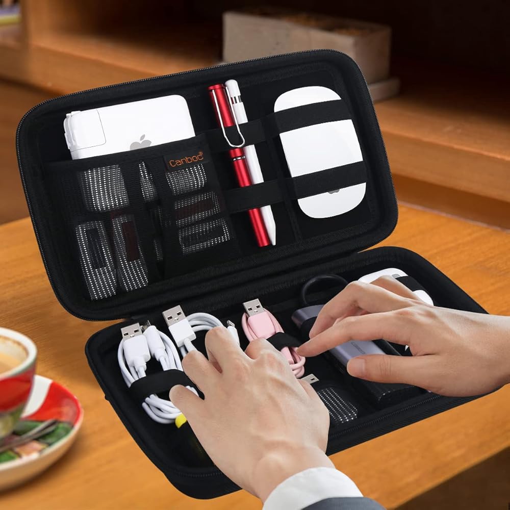 【منظمة وسهلة التخزين】 الجراب فقط! (لا يتم تضمين الملحقات الإلكترونية). تحتوي حقيبة التخزين الإلكترونية للسفر هذه على 5 حلقات مرنة صغيرة، والتي يمكن استخدامها لتخزين الملحقات الصغيرة مثل الكابلات الرفيعة وسماعات الأذن والأقلام وما إلى ذلك. الحلقتان المطاطيتان الكبيرتان مناسبتان للكابلات الأطول أو السميكة، ومحور USB C، والماوس، مما يمنع الكابلات من التشابك، تساعدك على تجميع جميع ملحقات المنتجات الإلكترونية والكابلات المختلفة معًا.