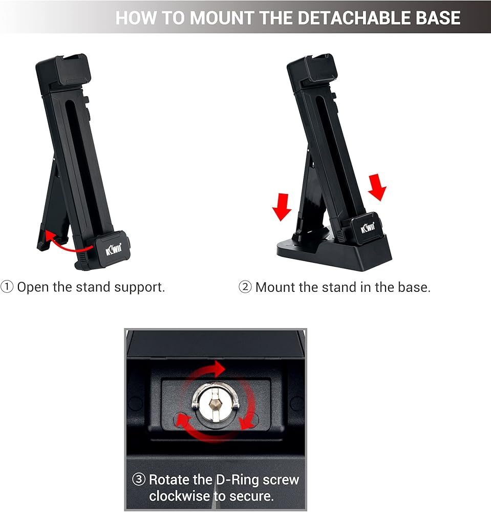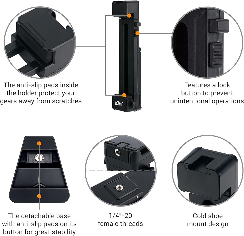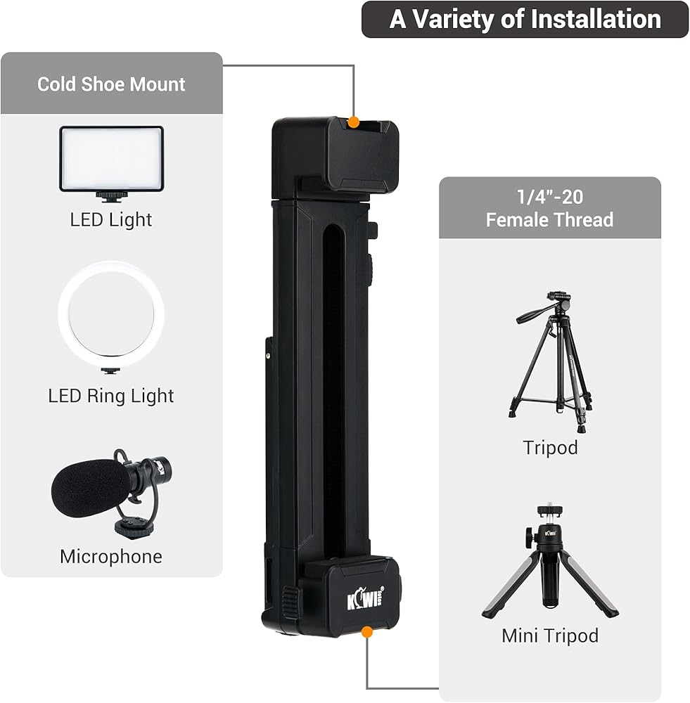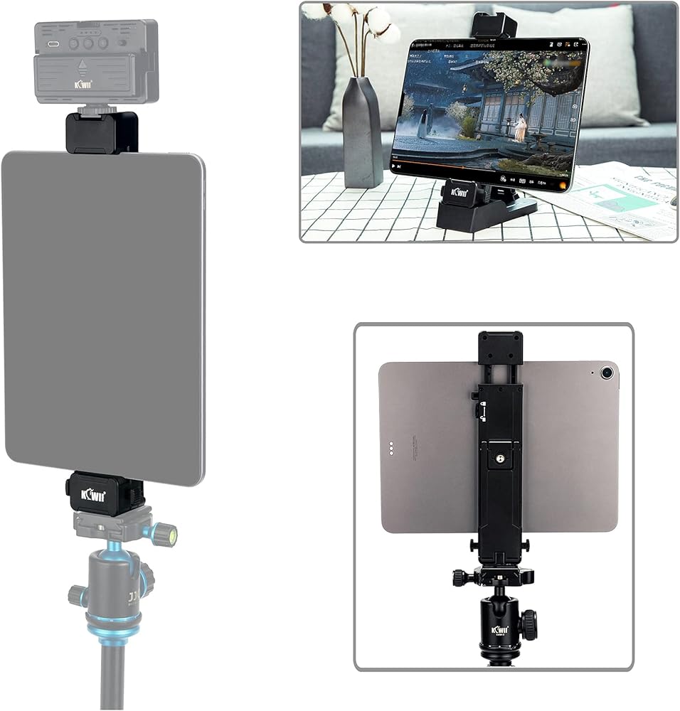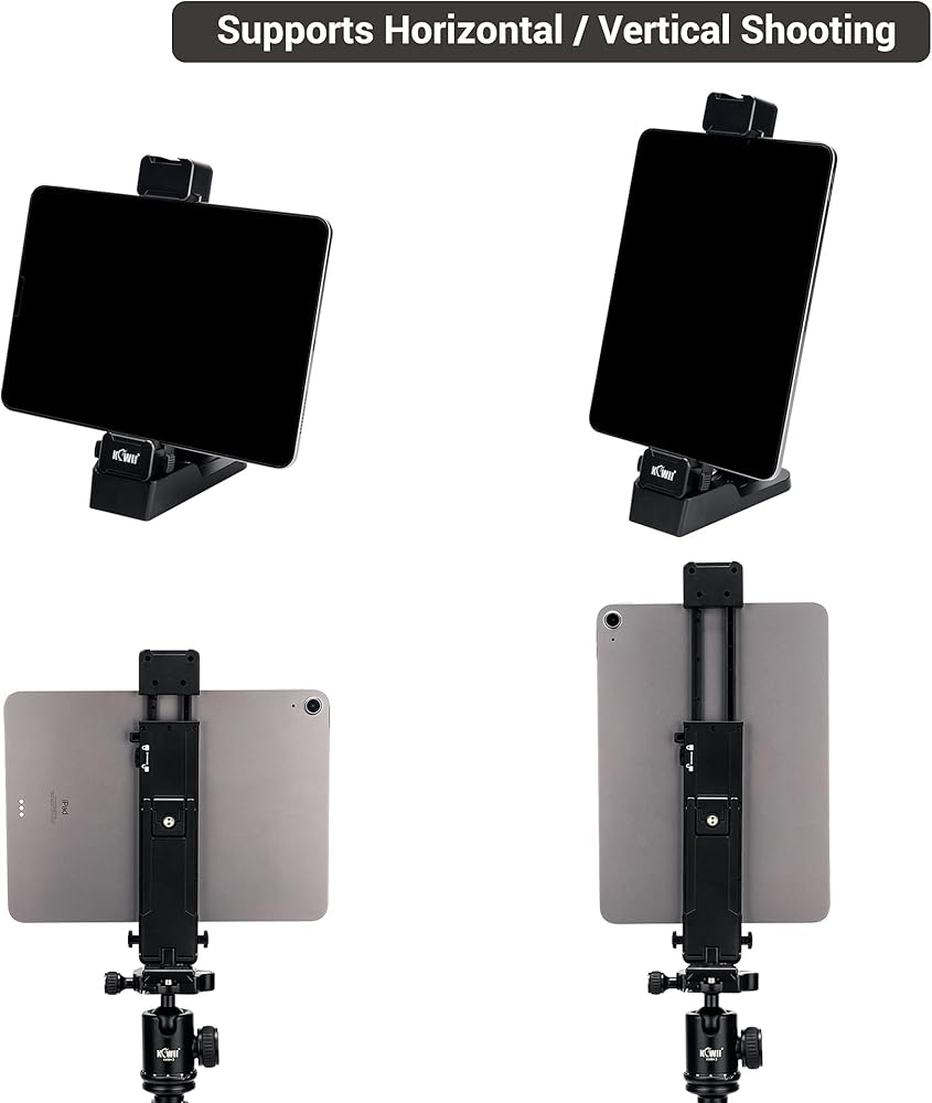 تم تصميم محول تثبيت حامل ثلاثي القوائم للكمبيوتر اللوحي 2 في 1 وحامل سطح المكتب من Kiwifotos لتركيب الأجهزة اللوحية والهواتف الذكية التي تتراوح من 3 إلى 13 بوصة إلى حامل ثلاثي القوائم وحامل أحادي وعصا سيلفي ومكتب. وهو يدعم التوجهات الرأسية والأفقية للعرض المتنوع. تشتمل الميزات الأخرى على 1/4"-20 خيطًا للحامل ثلاثي القوائم أو الحامل الأحادي أو عصا السيلفي، وزر منزلق لارتفاع قابل للتعديل وقفل أمان، ووسادة احتكاك مدمجة من مادة EVA لحماية جهازك من الخدوش اليومية والانزلاق، وحامل حذاء بارد على الجزء العلوي لتركيب الملحقات مثل ضوء LED والميكروفون وما إلى ذلك.
