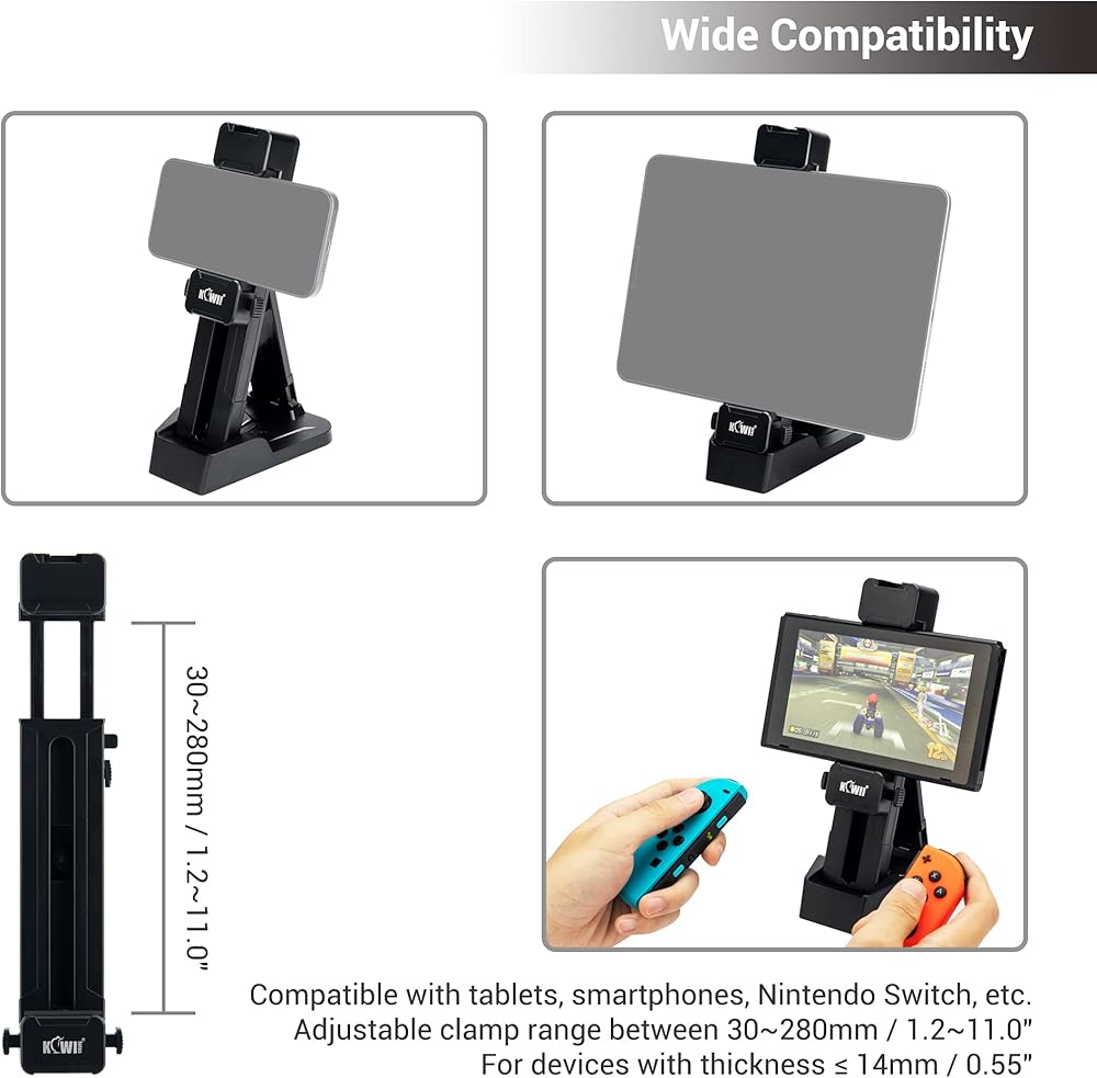 يتراوح طول المشبك القابل للتعديل بين 1.2-11.0 بوصة / 30-280 مم بعمق 0.55 بوصة / 14 مم، والذي يناسب معظم الأجهزة اللوحية والهواتف الذكية مقاس 3-13 بوصة مع أو بدون حافظة حماية إضافية أسفل سمك إجمالي يبلغ 0.55 بوصة / 14 مم، أدناه هي بعض الأجهزة المتوافقة: