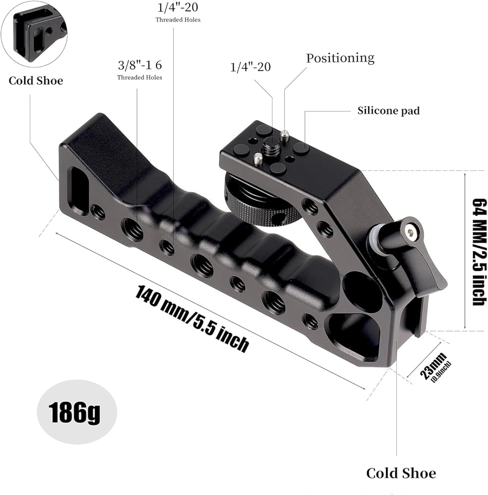 - The JLWIN aluminum top handle is designed for all dslr camera cage with 1/4" locating holes.