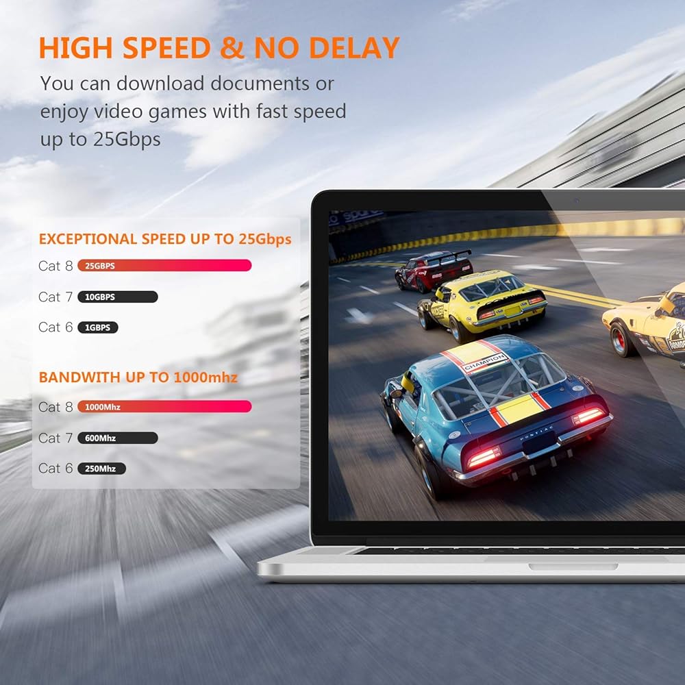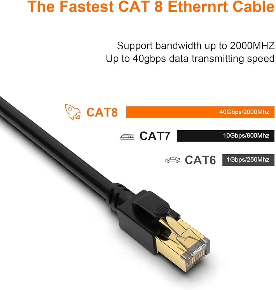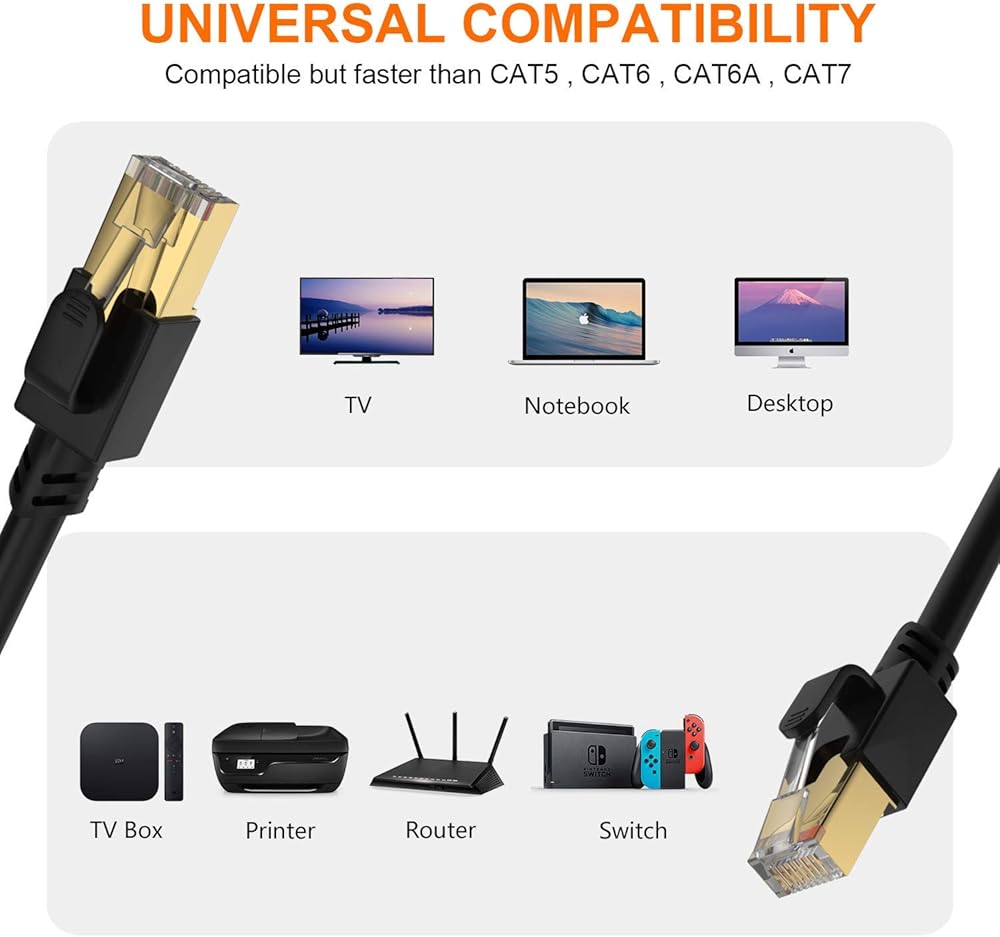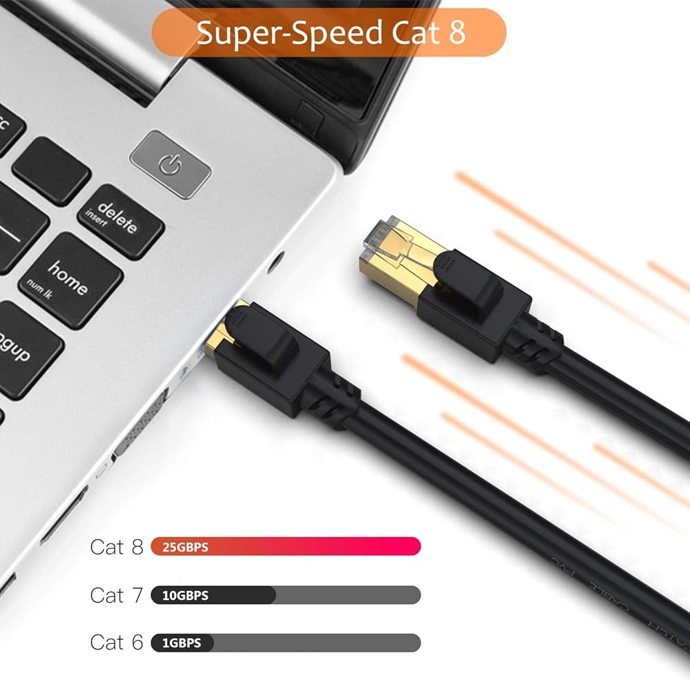 سرعة ثابتة: مصنوعة من 4 أزواج 100% 26WAG زوج ملتوي نقي وسميك (SFTP) من الأسلاك النحاسية مع موصل RJ45 في كل طرف. بالمقارنة مع كابل إيثرنت شبكة Cat7/Cat6/Cat6a/Cat5، يوفر التدريع الإضافي لكابل Cat 8 والجودة المحسنة في لف الأسلاك حماية أفضل من التداخل والضوضاء والتداخل الذي يمكن أن يقلل من جودة الإشارة، وسرعة الشبكة أكثر مستقر