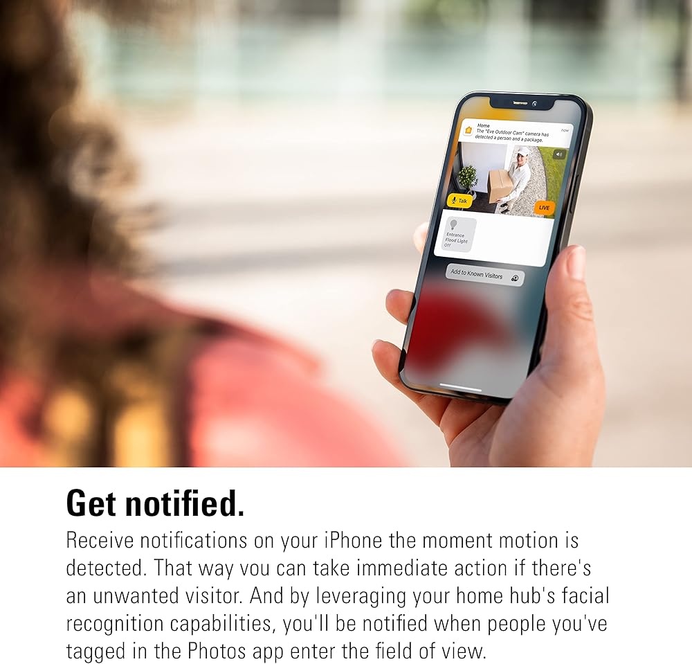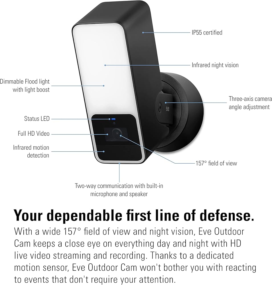 راقب منزلك عن كثب على مدار الساعة، واحصل على إشعارات غنية على جهاز iPhone الخاص بك عندما يحدث شيء ما. تجمع كاميرا Eve Outdoor Cam بين التكنولوجيا المتقدمة في علبة معدنية أنيقة وهي مصممة حصريًا لـ Apple HomeKit Secure Video، وهي مصممة من الألف إلى الياء للحفاظ على بياناتك آمنة ومساحتك الخاصة آمنة. عندما يكتشف مستشعر الحركة أي نشاط، تقوم كاميرا Eve Outdoor Cam بتشغيل الضوء الكاشف الخافت تلقائيًا. ومع مجال رؤية واسع يبلغ 157 درجة ورؤية ليلية، يمكنك مراقبة كل ركن من أركان منزلك عن كثب ليلًا ونهارًا وبتفاصيل دقيقة للغاية من خلال بث وتسجيل الفيديو المباشر عالي الدقة. عندما تشاهد بث الفيديو من كاميرا Eve Outdoor Cam أثناء تواجدك بالخارج، فإنك تتواصل مرة أخرى مع القاعدة، مباشرة عبر اتصال مشفر من طرف إلى طرف. يمكنك أيضًا اختيار الوقت الذي تريد أن يتم إعلامك فيه وما إذا كنت تريد إجراء تسجيلات كلما حدث شيء ما أو فقط في حالة اكتشاف أشخاص أو حيوانات أليفة أو مركبات أو طرود. اشعر بالأمان عندما تعلم أن لقطات الفيديو يتم تحليلها في خصوصية جدرانك الأربعة، وليس في سحابة عشوائية في الأثير. يتم تخزين تسجيلاتك بشكل آمن ومشفر بالكامل في iCloud الخاص بك، ولا يصل البث المباشر للكاميرا إلى السحابة أبدًا - ولا حتى إلى iCloud.