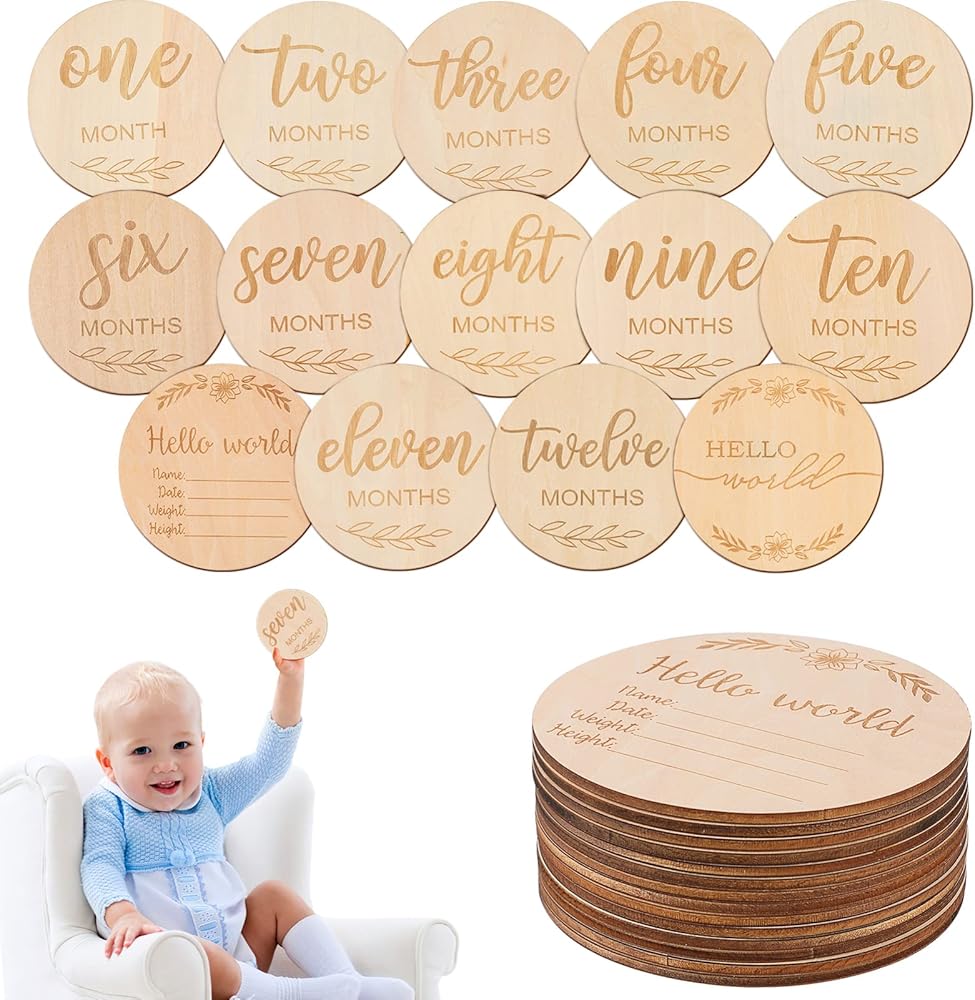 بطاقات المعالم الشهرية للأطفال من توياندونا - أقراص خشبية مستديرة بأحرف منقوشة، الدعائم المثالية للتصوير الفوتوغرافي لحديثي الولادة لتوثيق نمو طفلك، ودعامات التصوير الفوتوغرافي من حديثي الولادة إلى عمر عام واحد
