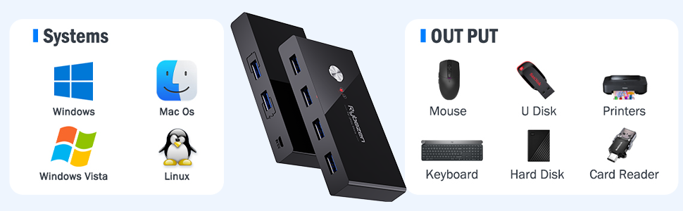 【جهازي كمبيوتر يشاركان أجهزة متعددة】يدعم محول USB 4 في 2 جهازي كمبيوتر يتشاركان 4 أجهزة USB مثل لوحات المفاتيح والماوس والطابعات وسماعات الرأس وكاميرات USB. قم بالتبديل بحرية بين كمبيوتر العمل الخاص بك والكمبيوتر الشخصي/الكمبيوتر المحمول وتعزيز كفاءة عملك.