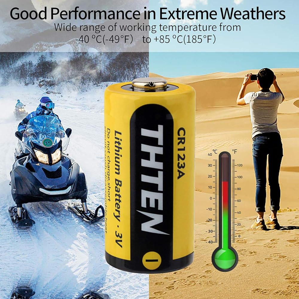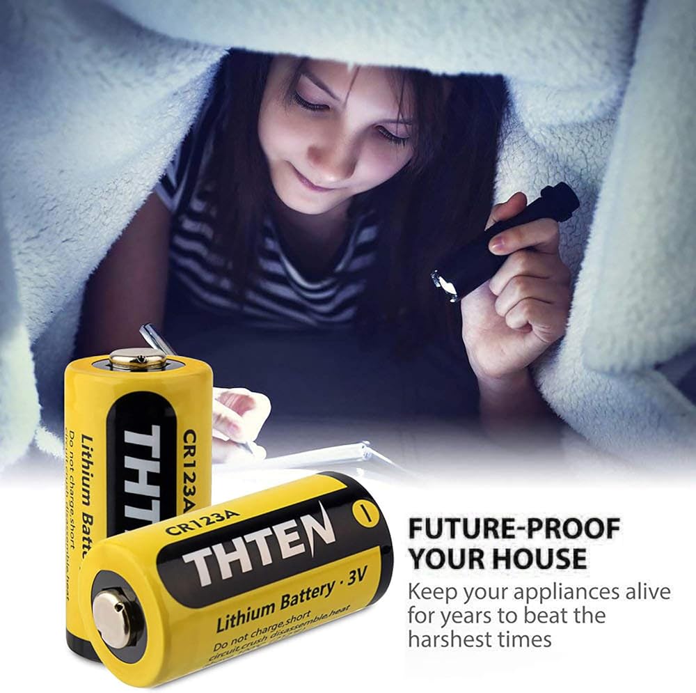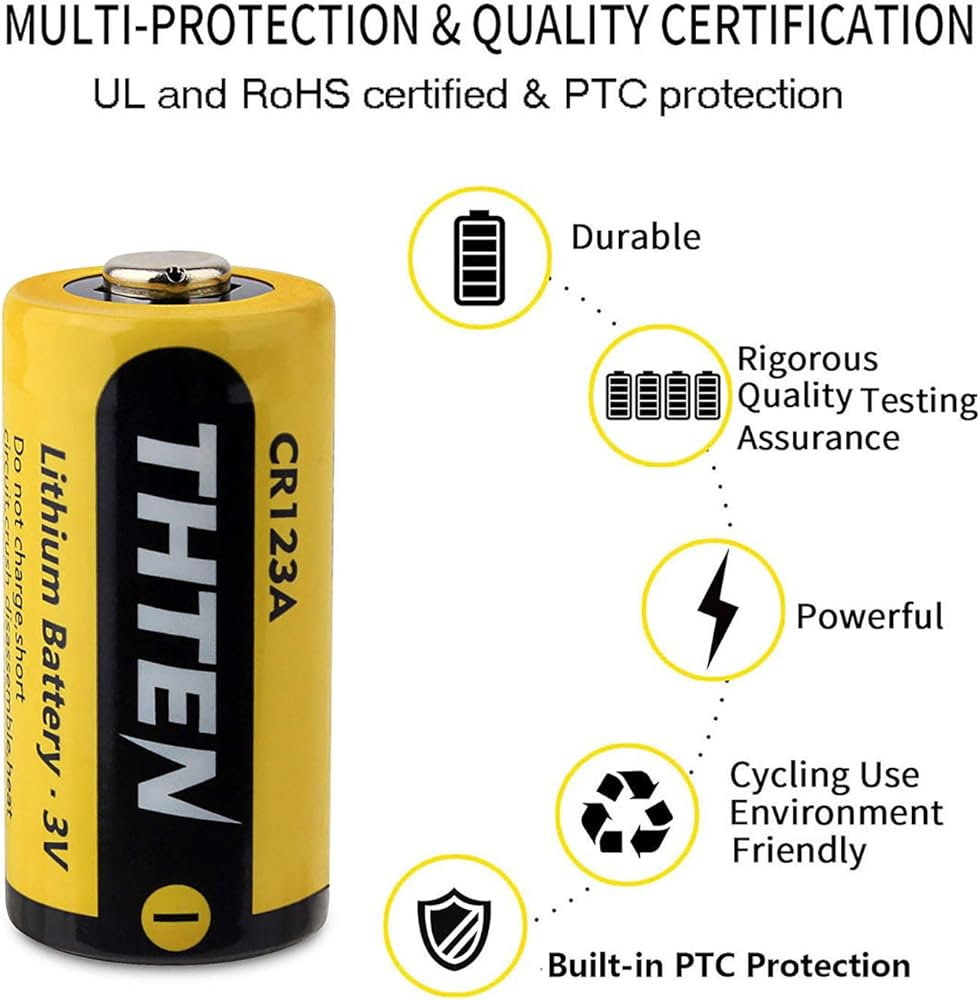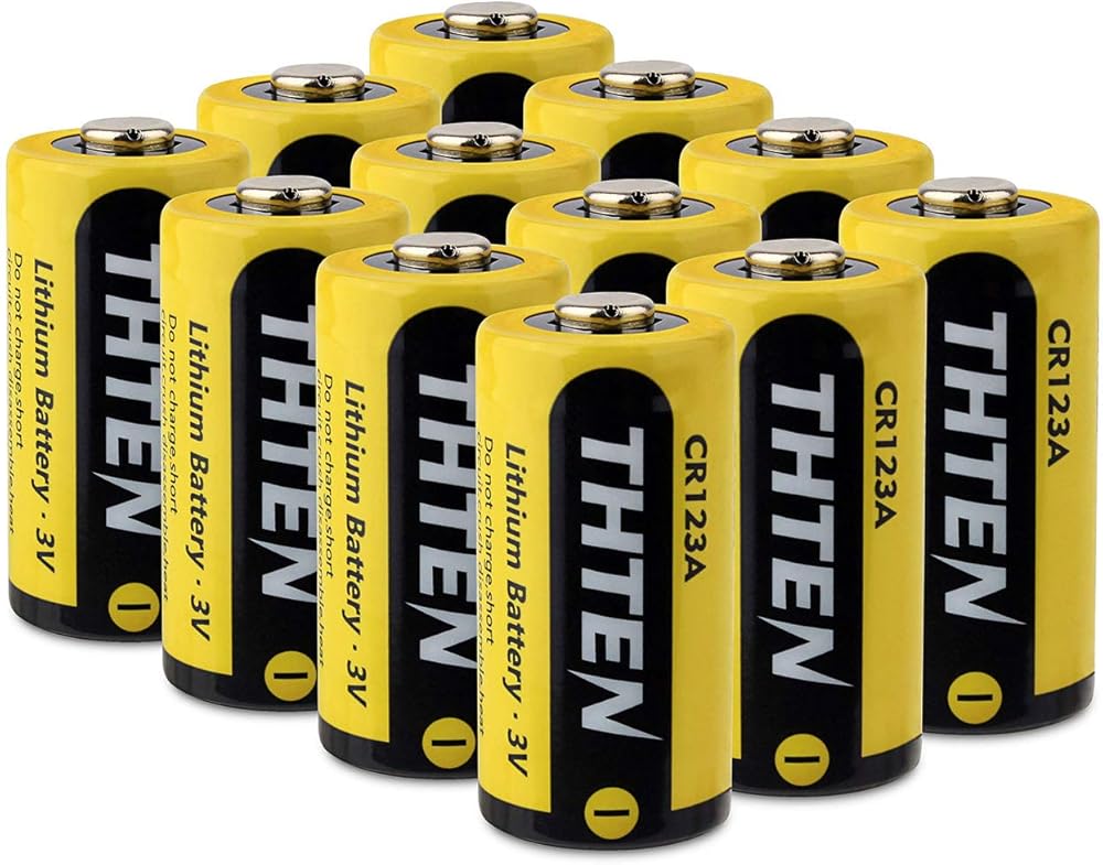 بطارية ليثيوم THTEN CR123A 3 فولت، 1600 مللي أمبير في الساعة عالية الطاقة غير قابلة لإعادة الشحن CR123 123A 123 CR17345 بطاريات صور مع حماية PTC بطاريات ليثيوم للصور لبولارويد، والميكروفونات، ومصباح يدوي، 12 حزمة